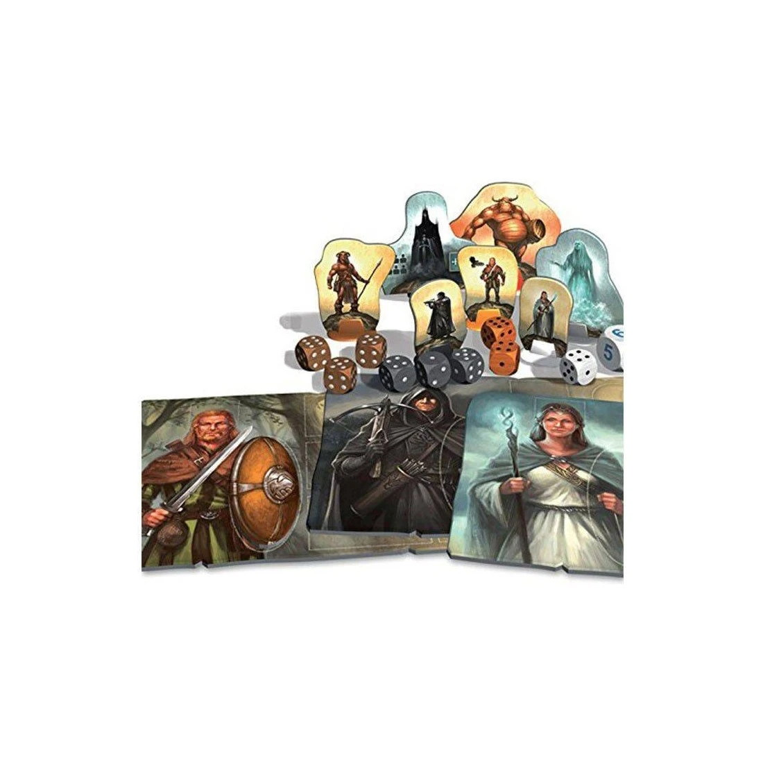 Contenu : 8 pions Héros, 1 Esprit des Eaux, 2 pions Héraut Noir, 1 Troll, Ivre, 1 Bouclier Fraternel, 1 Étoile, 3 Objets (Corbeau, Corne, Couteau), 10 dés (1 blanc, 2 oranges, 3 gris, 3 bruns et 1 grand dé blanc), 8 disques en bois aux couleurs des Héros (2 blancs, 2 oranges, 2 gris, 2 bruns), 4 cubes en bois (1 blanc, 1 orange, 1 gris, 1 brun), 12 supports en plastique (2 blancs, 2 oranges, 1 gris, 2 gris foncé, 2 bruns, 2 noirs, 1 rouge), 8 gommettes, 4 fiches de Héros, 2 Pistes des Créatures, 1 jeton Lever du Soleil, 4 disques en bois noirs et un livret de règles.