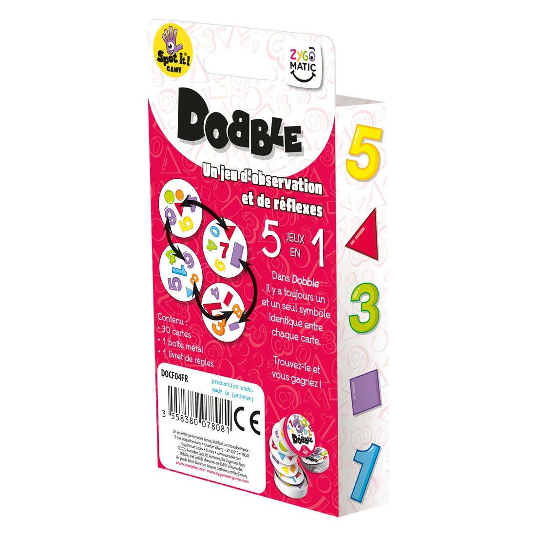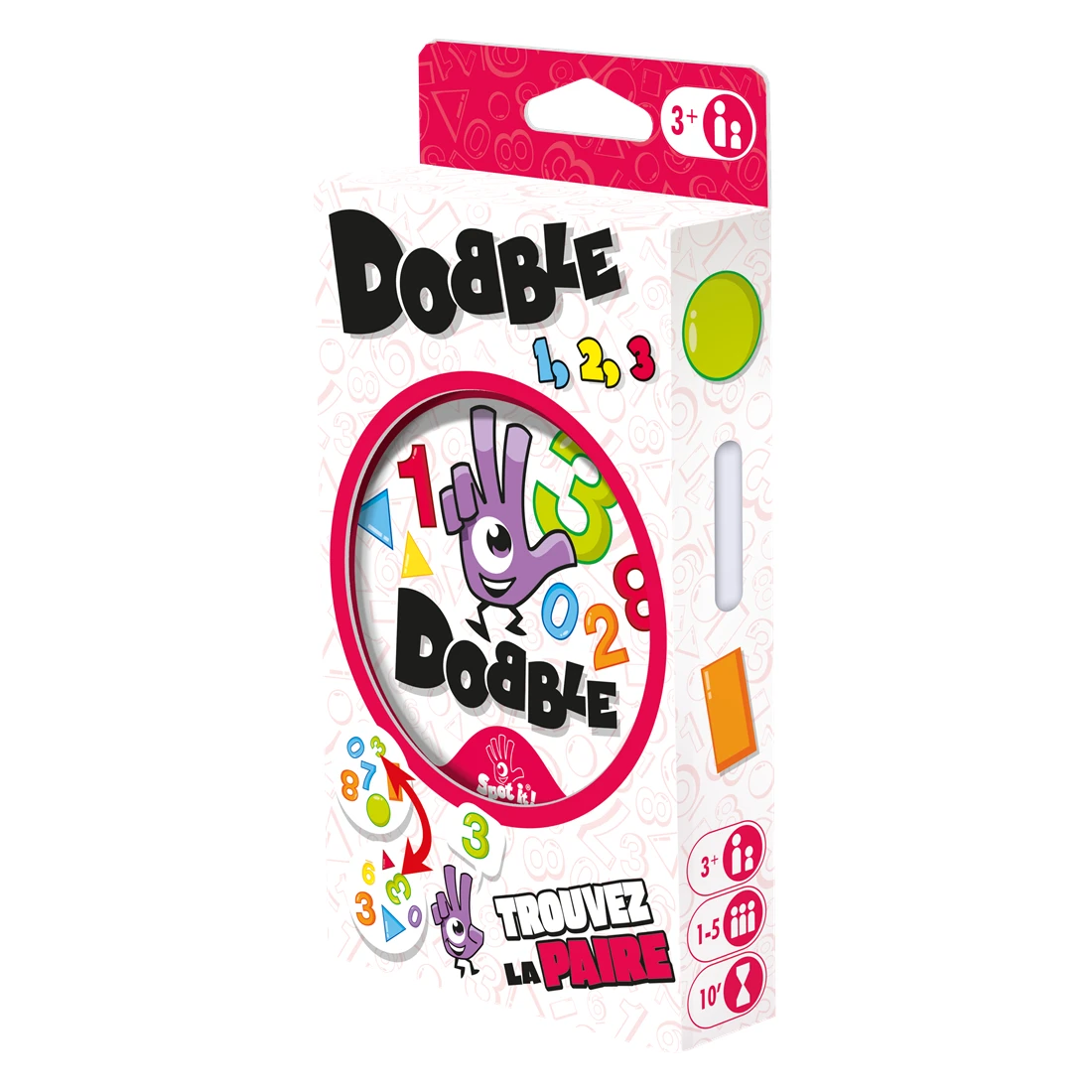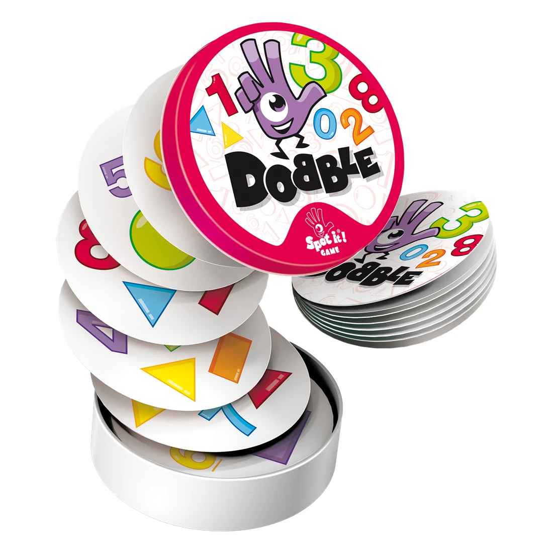 Dobble est un jeu d’observation et de rapidité dans lequel tous les joueurs jouent en même temps.55 cartes comportant chacune six chiffres ou formes géométriques, 5 variantes… et c’est parti ! Quel que soit le jeu choisi, repérez plus vite que vos adversaires le seul et unique symbole identique entre deux cartes puis nommez-le à haute voix.