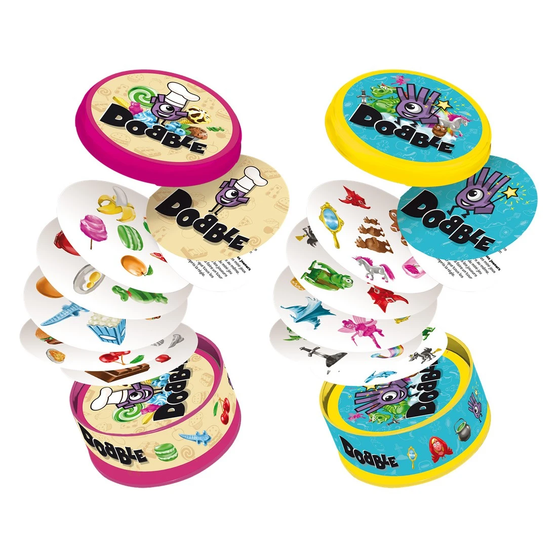 Retrouvez un univers enchanté et enchanteur avec Dobble Fantasia. Ce monde féerique aidera les enfants à développer leur imaginaire, deviendra un indispensable pour revivre les plus grands contes : la maison en pain d’épice, les licornes, fées et autres bottes de 7 lieues. L’occasion de raconter des histoires entre deux parties frénétiques !