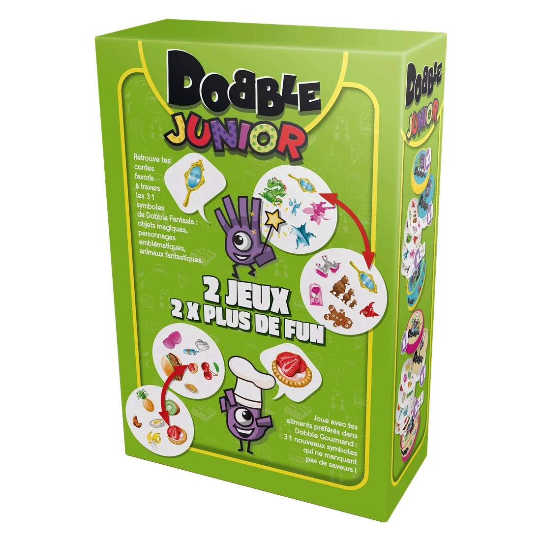 Dobble Junior rassemble deux boites de jeu, soit 2 fois plus de fun qu’une boite classique ! Y sont inclus deux nouveautés complètes : un Dobble Food et un Dobble Fantasia. Soyez le premier à repérer celui en commun entre deux cartes pour remporter la partie ! Dobble, un jeu 5 en 1