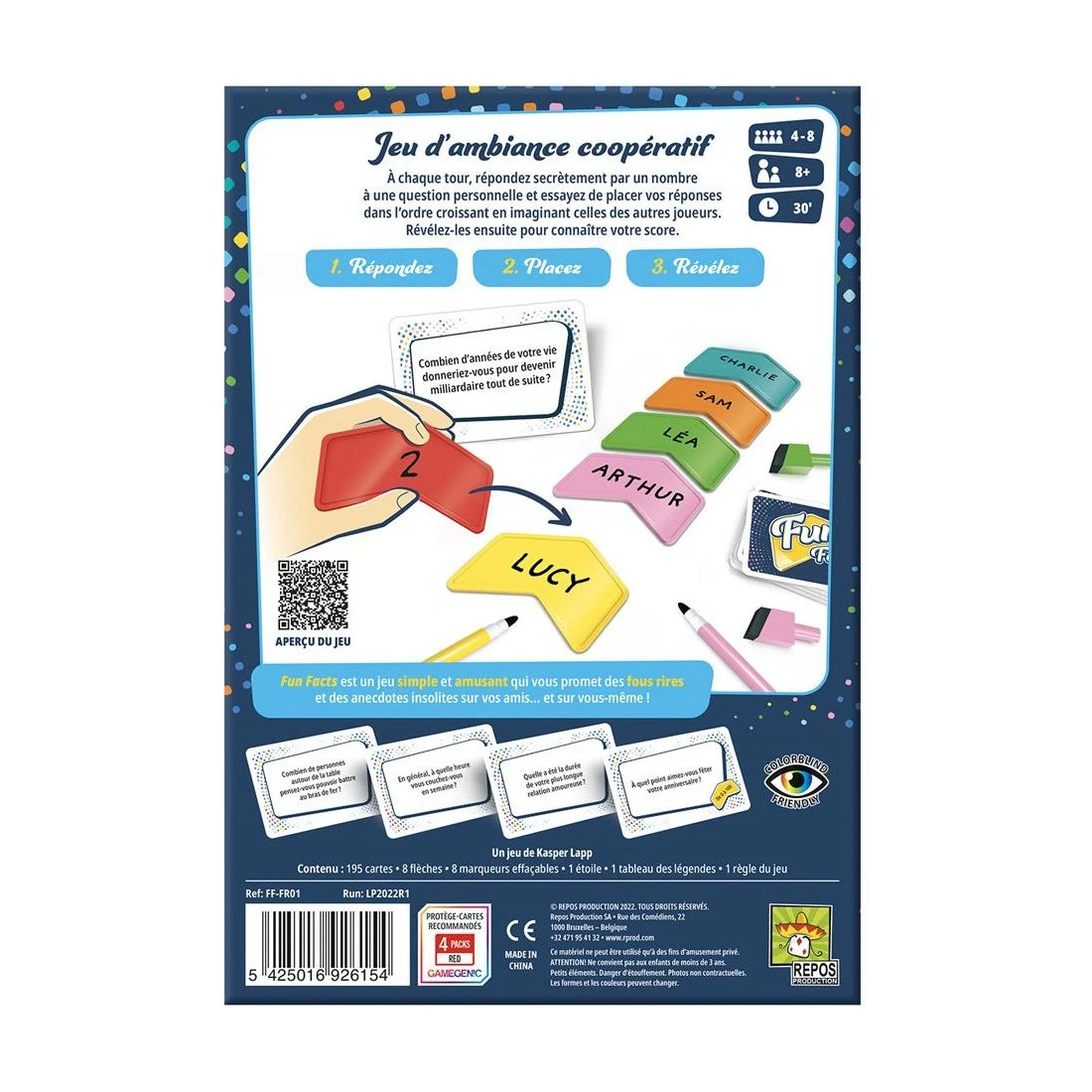 Fun Facts est un jeu d’ambiance coopératif de 4 à 8 joueurs dans lequel on essaie d’imaginer les réponses des autres joueurs à une série de questions.