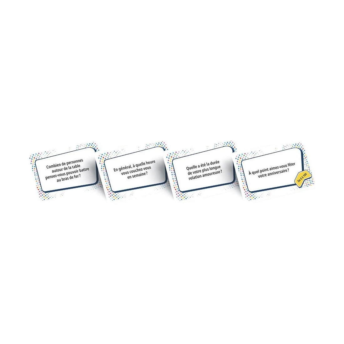 Chacun indique sa réponse au feutre sur une face de sa tablette, et son prénom sur l’autre. Ensuite, il s’agit de placer sa réponse au bon endroit parmi les réponses des autres joueurs. Les petites tablettes sont conçues de sorte à s’emboîter les unes dans les autres pour créer une flèche croissante. (Je sais que je joue avec Jean-Charles qui déteste les fêtes, Julie qui organise toujours son anniversaire des mois à l’avance, leur ami Tom que je ne connais pas bien, et moi j’aime quand même beaucoup fêter mon anniversaire, … Je vais m’évaluer à 80 sur 100 et tenter de placer ma tablette au-dessus de celle de Jean-Charles, mais en dessous de celle de Julie).