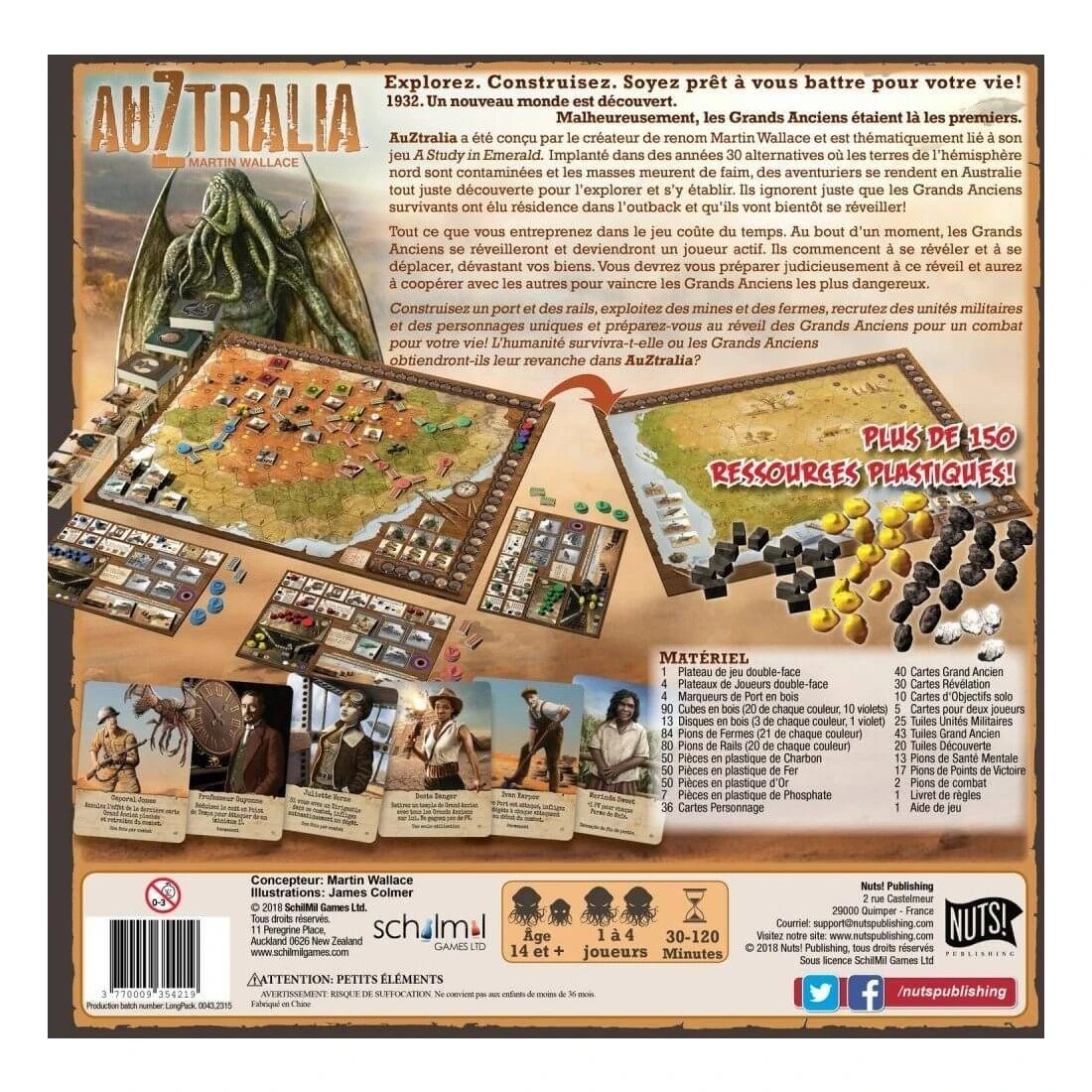 Tout ce que vous entreprenez dans le jeu coûte du temps. Vous devenez le joueur actif quand votre disque est sur l’espace le plus bas de la Piste de Temps. Vous prenez alors un des cubes de votre Qg et le placez dans l’une des Cases d’Action de votre Plateau de Joueur et effectuez l’action correspondante. Les Grands Anciens finiront par se réveiller et se déplaceront sur la carte, semant destruction et chaos. Vous devrez les attaquer avant qu’ils ne s’en prennent à vos biens. La partie se termine quand tout le monde a dépensé un certain nombre de Points de Temps (ou qu’un port a été détruit). Le vainqueur sera le joueur avec le plus de points de victoire… et ce sera peut-être les Grands Anciens !Référence Nuts Publishing : NUTS-AUZ-FR
