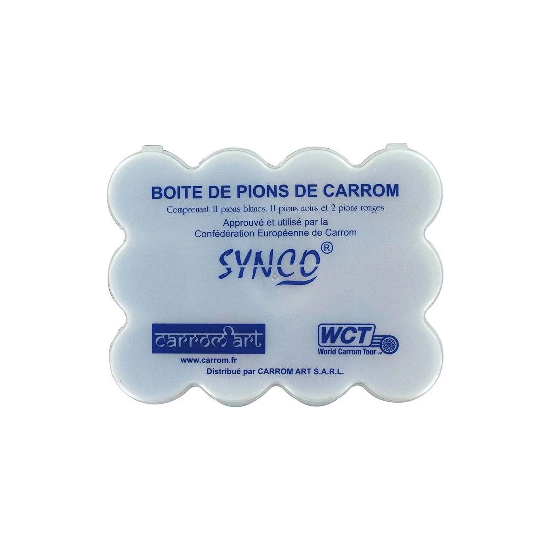 La boite de pions de Carrom ‘Break To Finish’ comprend 11 pions Noirs, 11 pions Blancs et 2 pions Rouges.