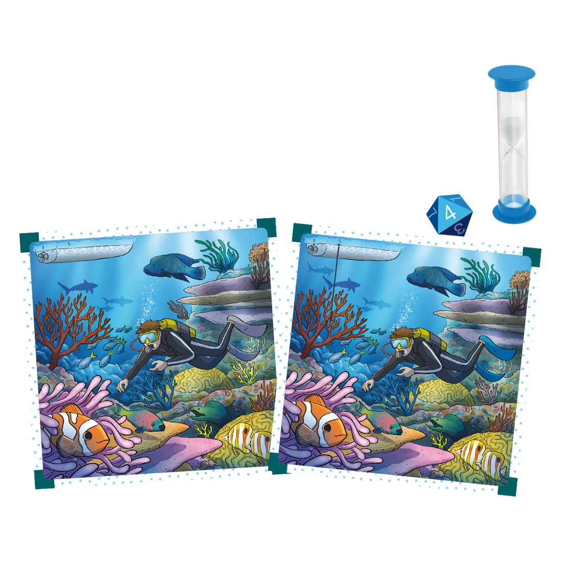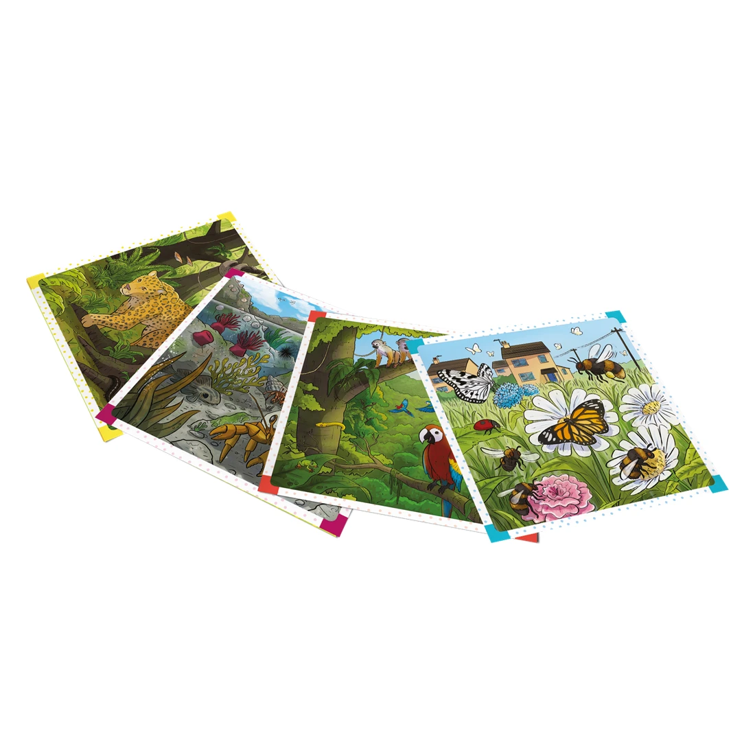Les joueurs actifs observent deux cartes qui comportent 6 différences, puis doit, de mémoire, en citer autant qu’indiqué par le dé ! Si le but est atteint, le joueur remporte la carte. Celle ou celui qui en a le plus à la fin de la partie la gagne. Chaque illustration se trouve en 4 exemplaires, pour jouer jusqu’à quatre.« Dans la Nature » contient des animaux du monde entier, du jardin à l’Antarctique !