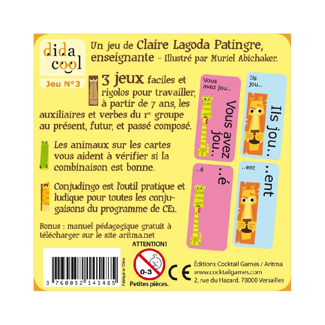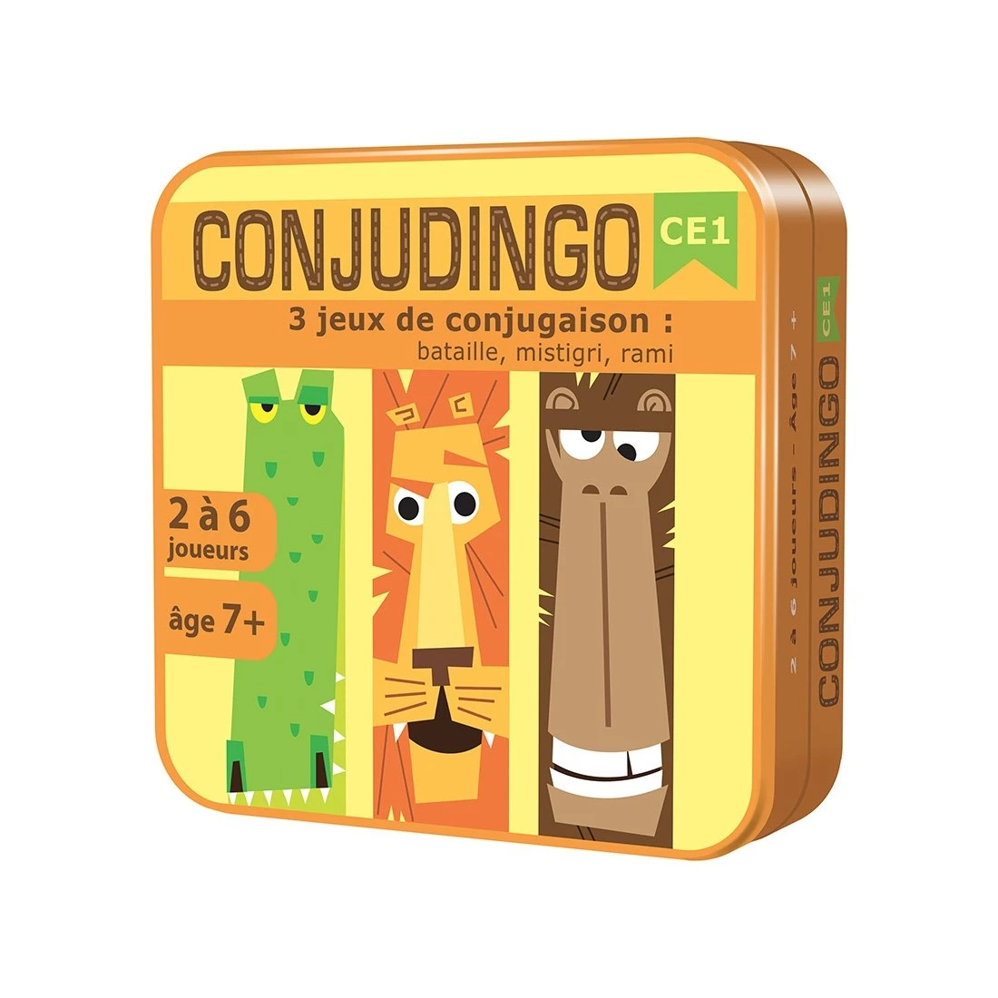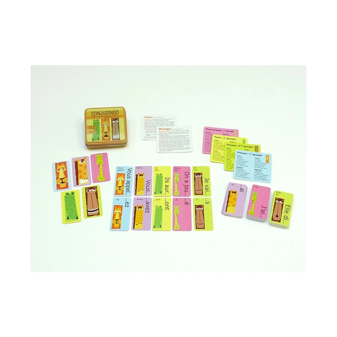 Il y en aura pour tous les goûts avec un jeu de bataille, un rami et un mistigri ! Conjudingo allie trois petits jeux rigolos à un système de vérification des réponses aussi mignon qu’astucieux : les animaux sur les cartes permettent de voir d’un seul coup d’œil si une réponse est correcte ou non !