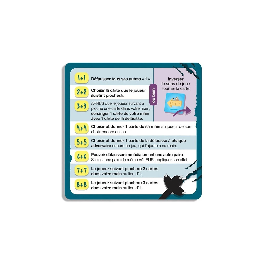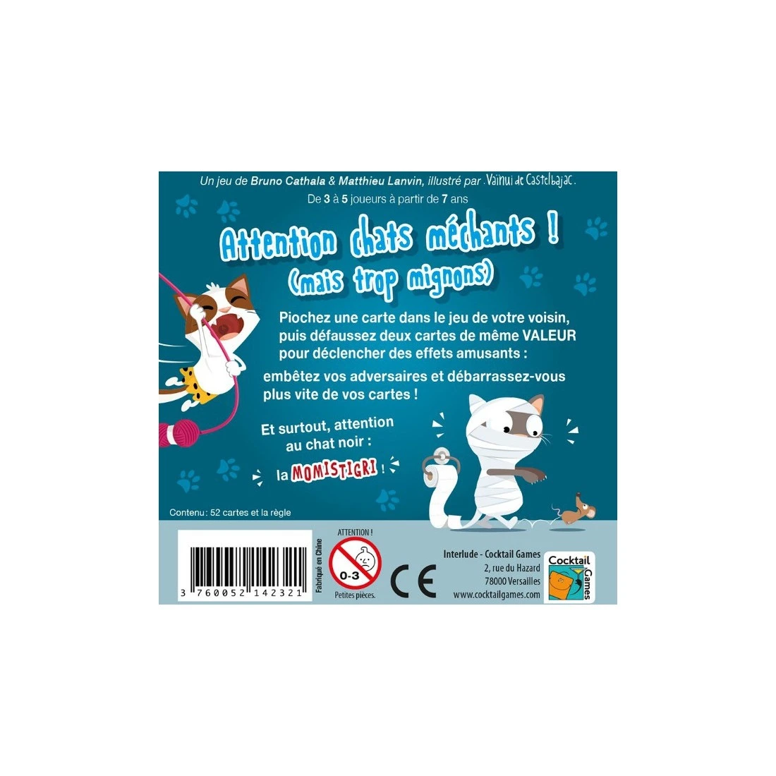 Attention chats méchants… et mignons ! Piochez une carte dans le jeu de votre voisin, puis défaussez deux cartes de même valeur pour déclencher des effets amusants et embêter les adversaires ! Surtout, méfiez-vous du chat noir : la momistigri ! Le classique jeu du Mistigri est revisité avec des effets fun et fous pour jouer entre chats chafouins !