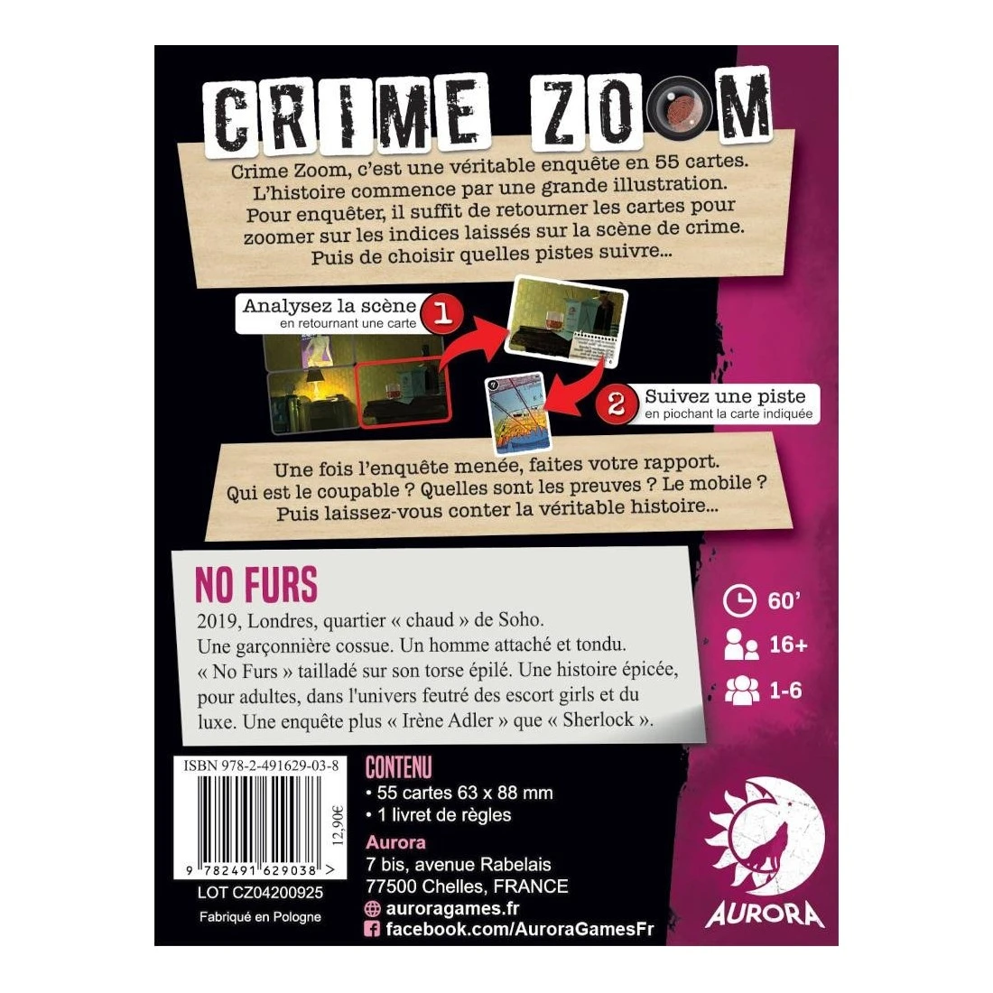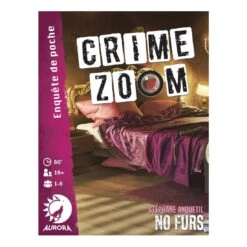 Dans Crime Zoom, vous mènerez votre enquête librement. Discutez entre joueurs pour choisir les pistes à suivre. Et dès que vous pensez avoir résolu l’enquête, rendez-vous au questionnaire. Qui est le coupable ? Quel est son mobile ? Quelle est l’arme du crime ? Et quelques questions subsidiaires bien évidemment…. Une scène de crime s’étale sur plusieurs cartes pour former une grande illustration. Et pour enquêter, rien de plus simple. Prenez une carte pour la regarder de plus près. Un élément vous intrigue ? Retournez la carte et découvrez ce qu’est ce petit papier sur la table de chevet.Référence Aurora : JDPAUR007