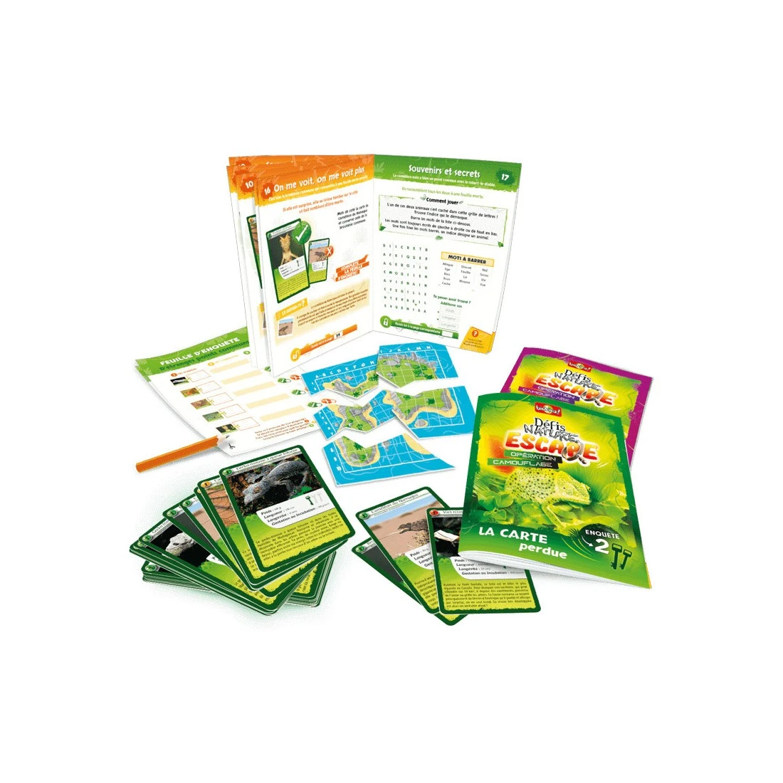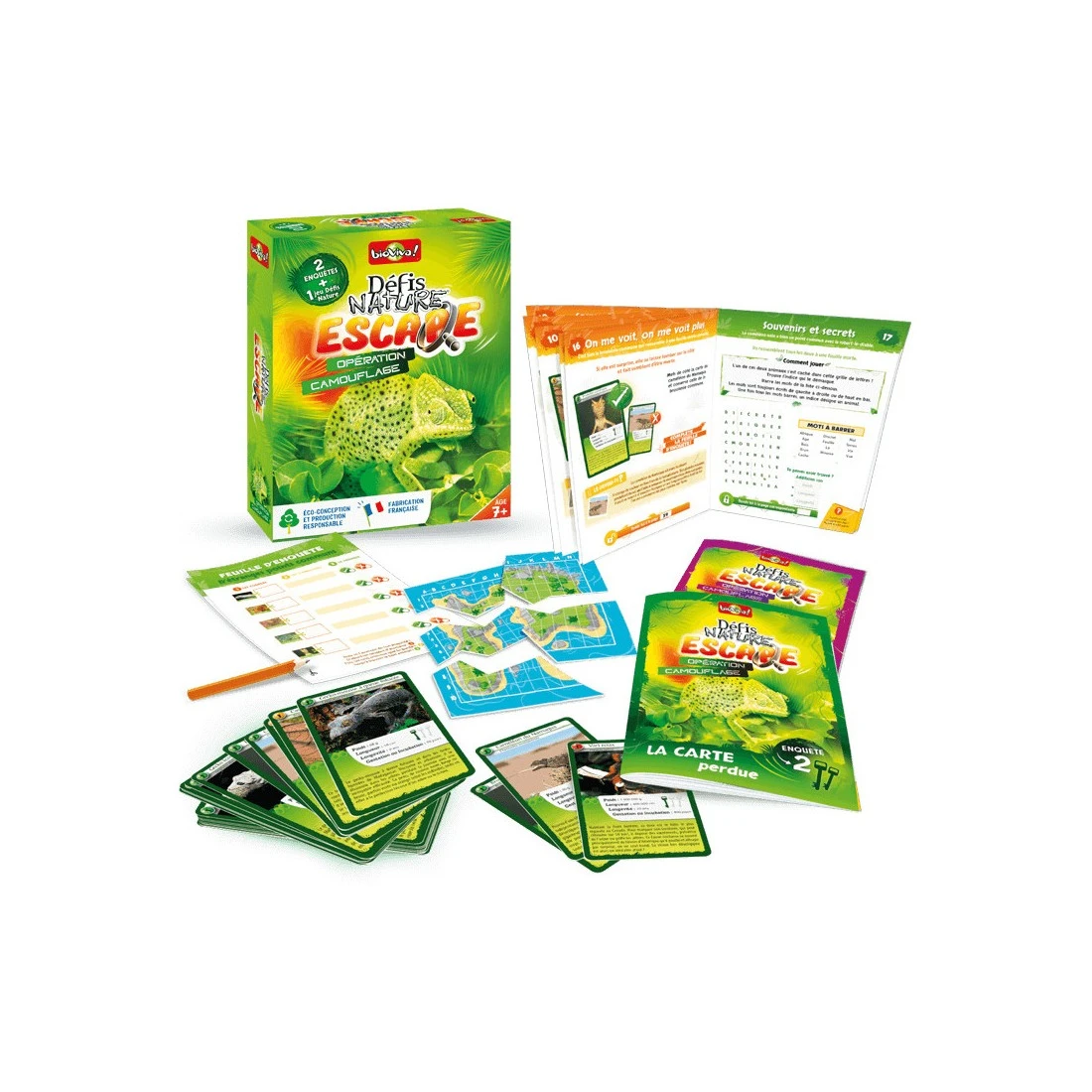 Alors, prêts à relever le défi ? De 1 à 3 joueurs. Dès 7 ans. Fabriqué en France. CaractéristiquesCaractéristiques:Défis Nature Escape – Opération camouflage Le but du jeu ? Deux enquêtes à résoudre grâce aux cartes Défis Nature incluses. Pour y arriver, tu devras étudier les cartes dans leurs moindres détails pour y trouver des indices, des similitudes, des infos étonnantes et t’en servir pour résoudre les énigmes !