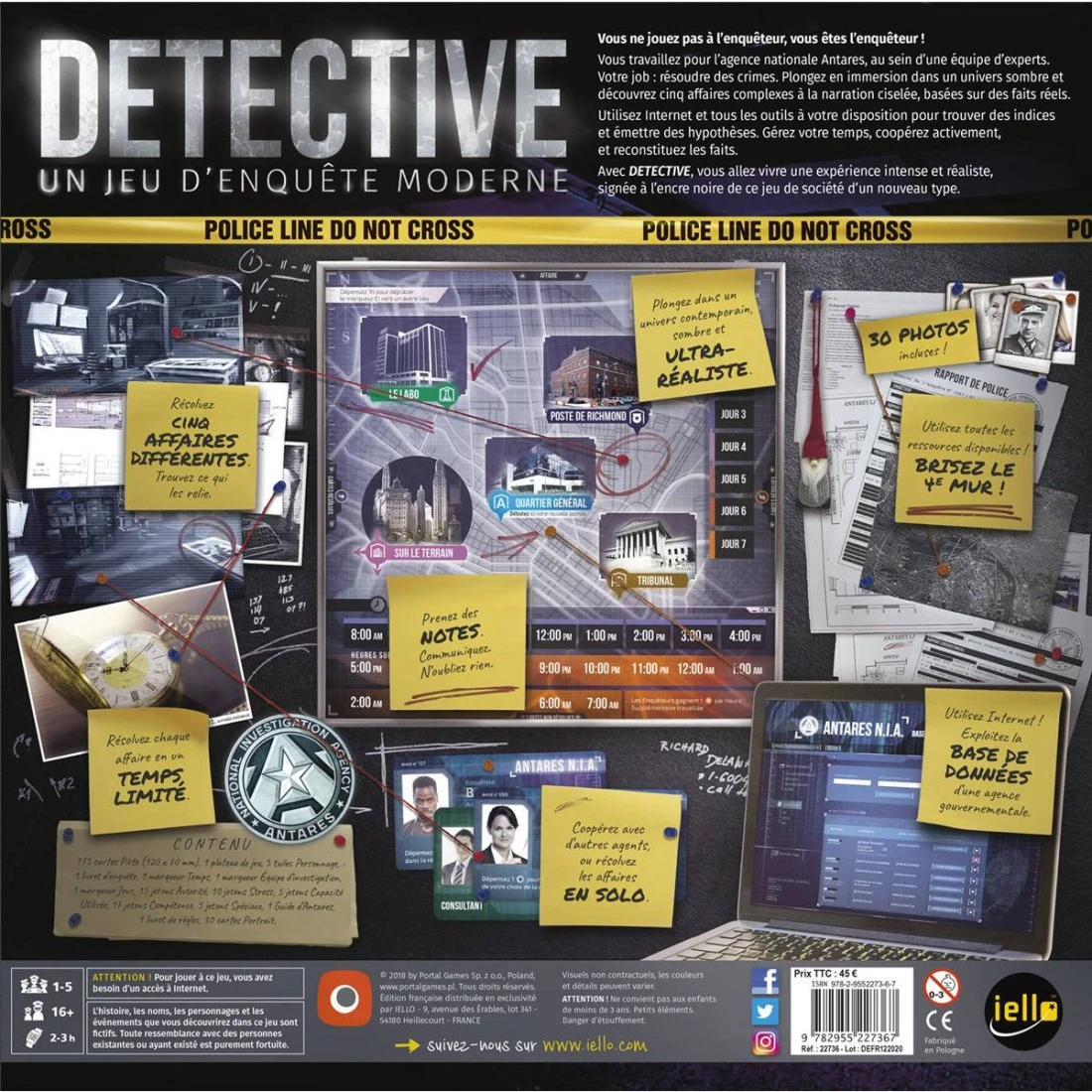 Detective est un jeu de société immersif qui redéfinit le jeu d’enquête. Il mêle plateau de jeu, narration, exploitation de bases de données, recherche sur Internet et dialogue permanent entre joueurs. Plongez dans des affaires complexes, sombres et captivantes. La narration ciselée vous précipite dans une ambiance pesante qui ne manquera pas d’influencer vos choix. Descriptions, interrogatoires, recherches, décisions : chaque affaire saura vous tenir en haleine et vous inciter à découvrir la vérité. Detective, c’est une nouvelle expérience de jeu à haute tension, qui ira vous chercher jusque dans vos derniers retranchements.