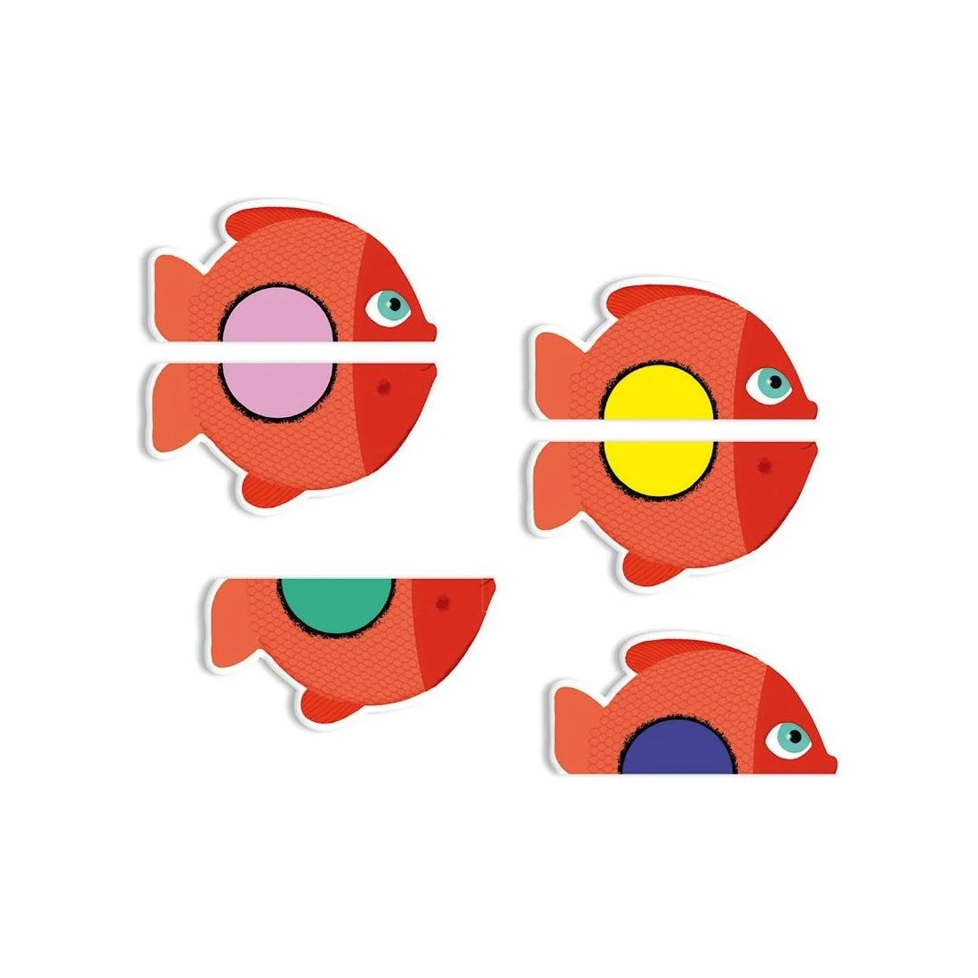 Pour réussir une bonne pêche, il faut des poissons entiers ! Qui sera le premier à en pêcher 4 ? Au début du jeu, les 24 demi-poissons sont placés en vrac au centre de la table, face visible. Tous les joueurs jouent en même temps et tentent de reconstituer au plus vite 4 poissons pour gagner la partie. Attention, pour que le poisson soit valide, il faut retrouver les 2 bons côtés avec la même tache de couleur !
