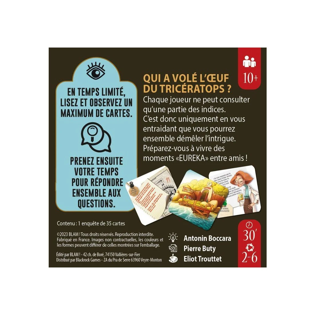 Plus ils accumulent les bonnes réponses, plus ils accèdent à un rang d’enquêteur élevé ! Une partie dure, en moyenne, une trentaine de minutes. Son format et sa mécanique de jeu basée sur la discussion en font un compagnon idéal pour l’apéro ou les soirées entre amis.