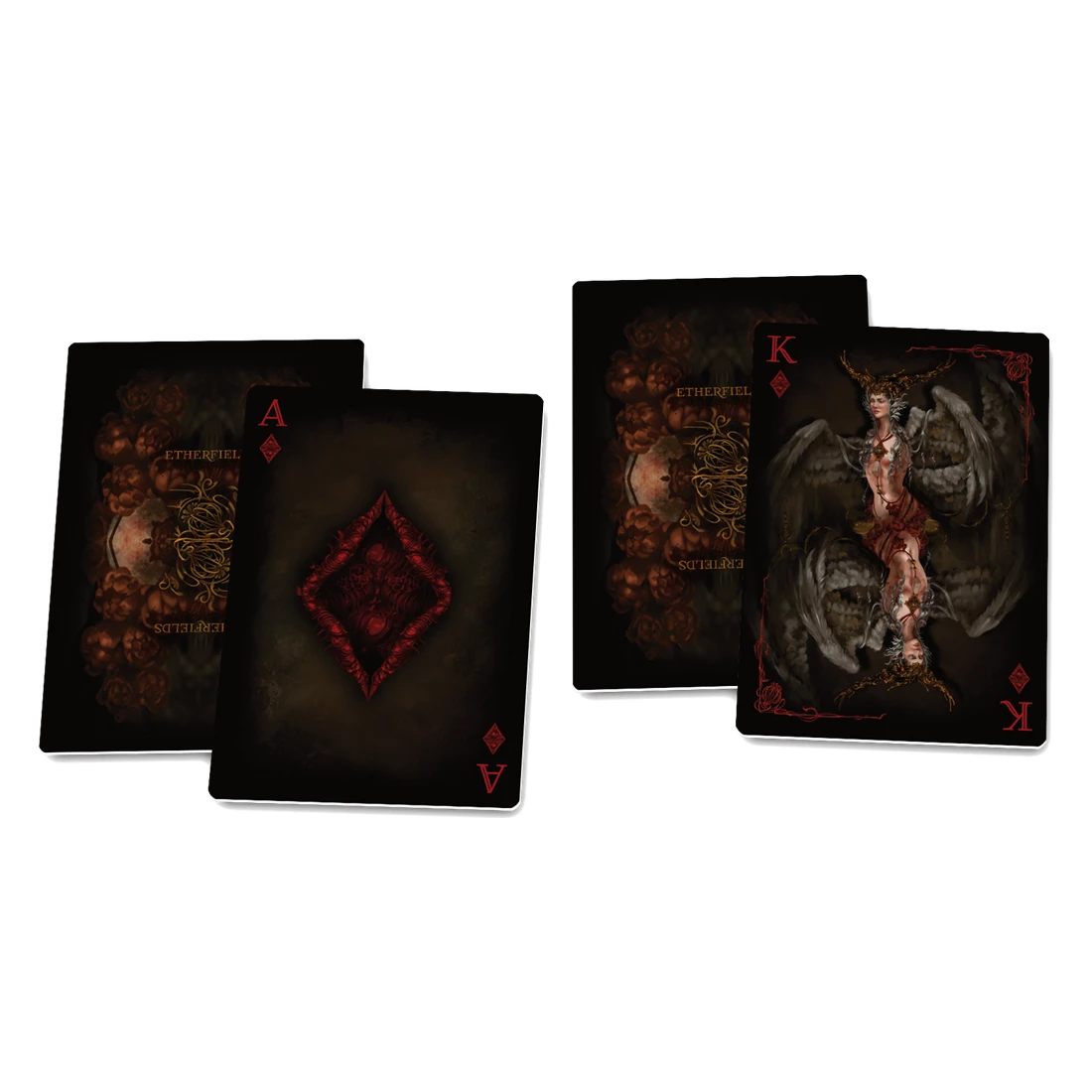 Etherfields : Jeu de 54 cartes à jouer standard avec des illustrations du jeu Etherfields. Il y a un petit mécanisme de gameplay surprise qui peut être utilisé dans le jeu Etherfields.