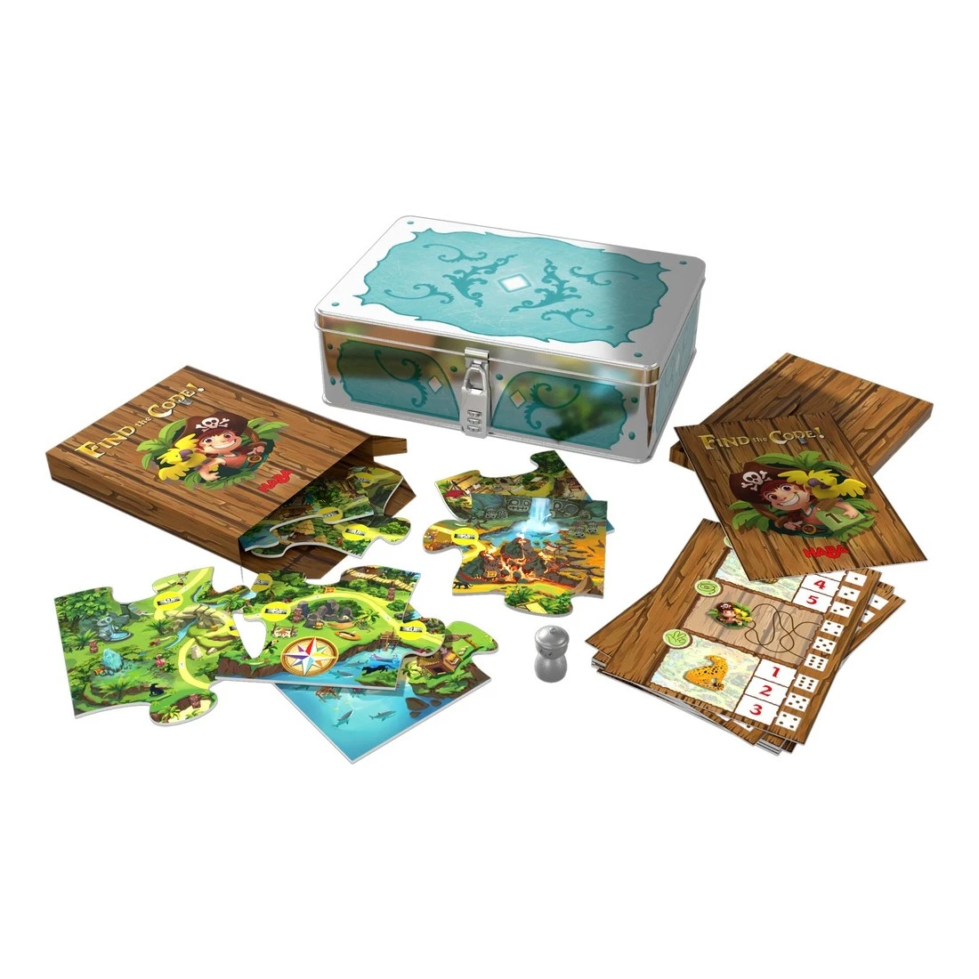 Contenu: 1 coffre à trésor, 1 cadenas à code, 1 boîte à énigmes, 1 chemise cartonnée, 12 cartes-énigmes, 9 pièces de puzzle (qui forment une carte au trésor une fois assemblées), 1 figurine, 1 règle du jeu.
