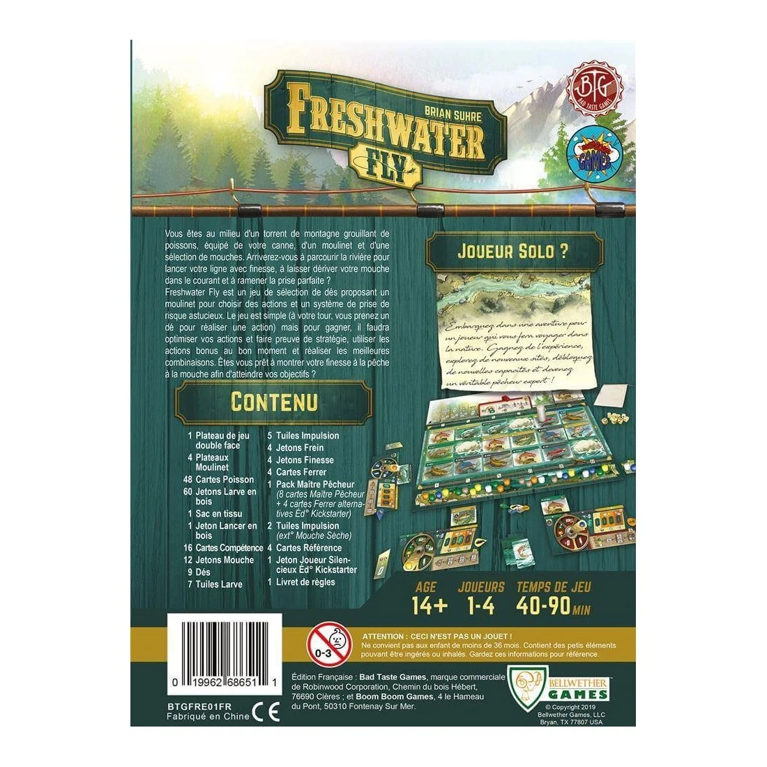Quand tous les dés ont été choisis, la rivière change, les cartes glissent et d’autres arrivent. Les poissons pêchés et les mouches utilisées permettent de réaliser des objectifs communs ou personnels qui rapprochent de la victoire. Le jeu s’arrête quand un joueur attrape son septième poisson.Référence Bad Taste Games : BADFRE01FR
