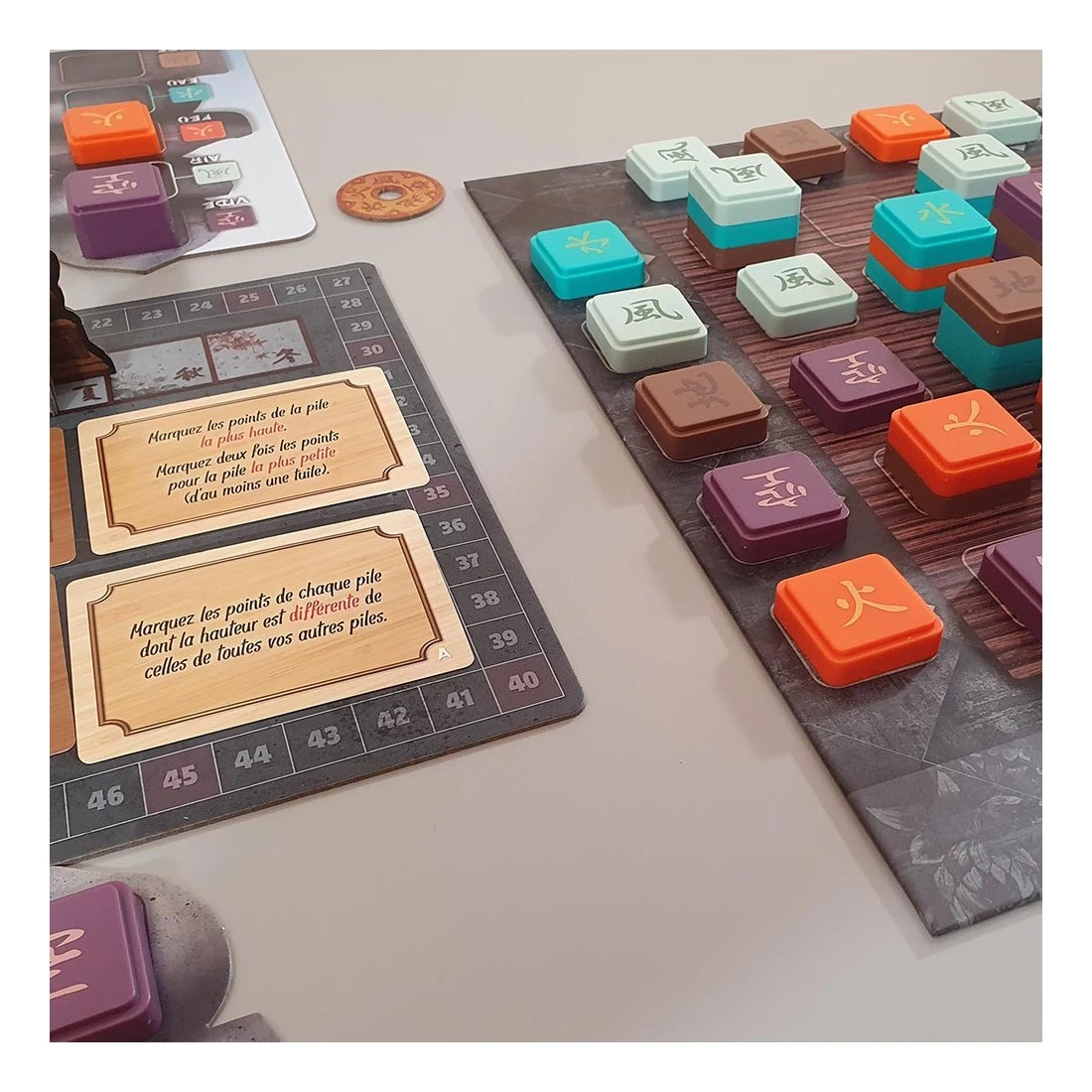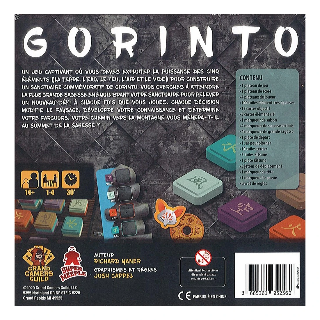 Collectez des tuiles pour construire un Gorinto sur votre plateau qui créera la plus grande sagesse en fonction des deux objectifs et des deux éléments clés.À chaque tour, vous déplacerez une tuile du Chemin vers la Montagne et vous collecterez de nouvelles tuiles en fonction de celle que vous avez déplacée et de la connaissance que vous avez acquise de cet élément. À la fin de chaque saison, les joueurs gagneront de la sagesse en fonction des cartes Objectif. À la fin de la partie, les joueurs gagneront également de la sagesse pour les éléments clés du jeu.