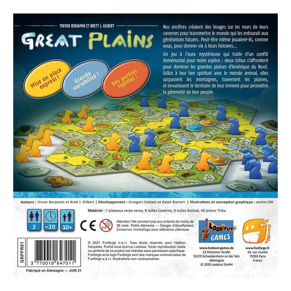 Dans Great Plains, deux joueurs s’affrontent pour étendre leur tribu plus vite et plus loin que celle de leur adversaire. Au début de la partie, les joueurs mélangent les dalles du plateau de jeu, afin de créer un plateau unique. Ils placent leurs cavernes, une par une, l’un après l’autre, sur des points stratégiques du plateau.
