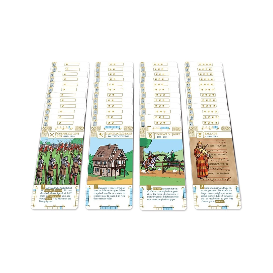 Ce jeu se compose de 8 familles différentes de 7 cartes (Peuples et dynasties/Inventions et techniques/Culture et Loisirs/Architecture/Personnages/Guerres/Armements/Évènements). Les 56 cartes du jeu sont composées d’un titre, de dates (périodes de dates), d’une illustration originale et d’une devinette. Les cartes sont classées en 4 niveaux de progression.