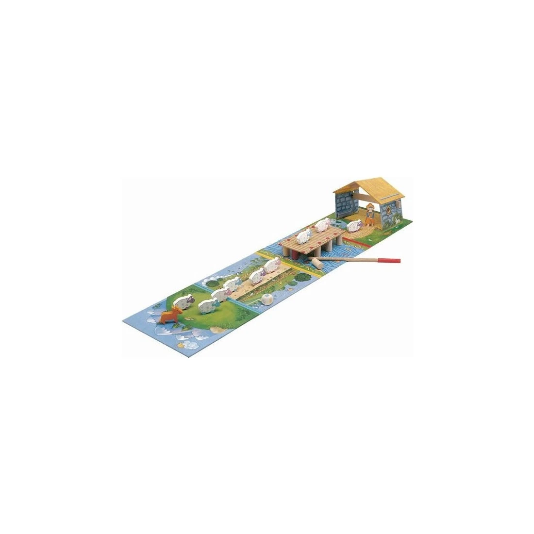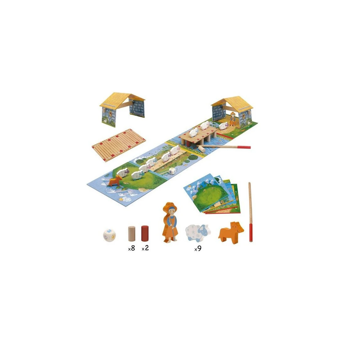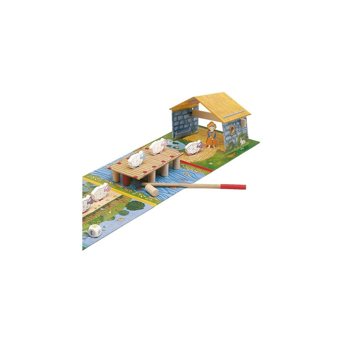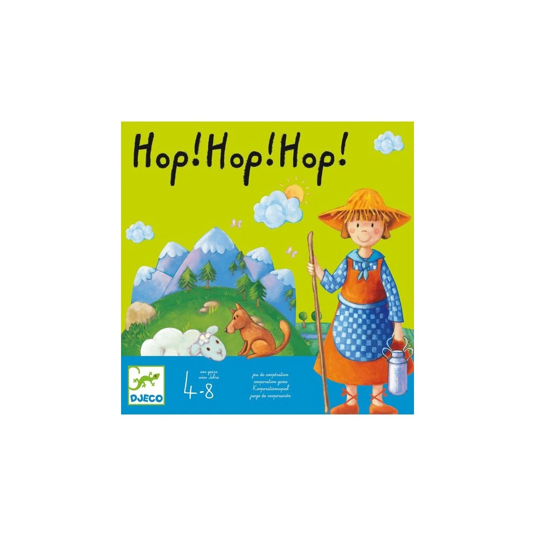l’avis des jeux de loïc : parfait ! hop ! hop ! hop ! est un jeu signé djeco. et vous le reconnaîtrez au premier coup dœil, en regardant la boite… mais aussi au second, en l’ouvrant ! illustrations, couleurs, qualité du matériel, règles ‘internationales’… tout invite à jouer. vous trouverez, dans la boite : – un très joli jeu. – de la coopération. – du hasard (dé). – de l’adresse (un peu). – de la stratégie (un peu aussi). parfait pour les 4/8 ans. peut se tenter dès 3 ans. comment y jouer ? c’est un jeu coopératif. a son tour, il s’agit de lancer le dé. celui-ci indique : – une montagne, une fleur ou un pont qui oblige à avancer un pion (mouton/chien/bergère) vers l’emplacement correspondant. – un soleil ou un saute-mouton pour avancer un ou deux pions (mouton/chien/bergère) de son choix sur le plateau suivant (là, il faut réfléchir un petit peu) – le vent, qui emporte un pilier du pont ! etant entendu que la bergère précède toujours son troupeau et que le chien ferme la marche ! il faudra réussir à faire traverser tous les personnages avant que le vent détruise le pont. matériel : 4 plateaux décorés, 1 bergerie et sa poutrelle en bois, 1 pont, 10 piliers de pont en bois, 1 baguette en bois, 1 bergère en bois, 9 moutons en bois, un chien en bois lui aussi, 1 dé en bois et une règle ! fabriqué en asie