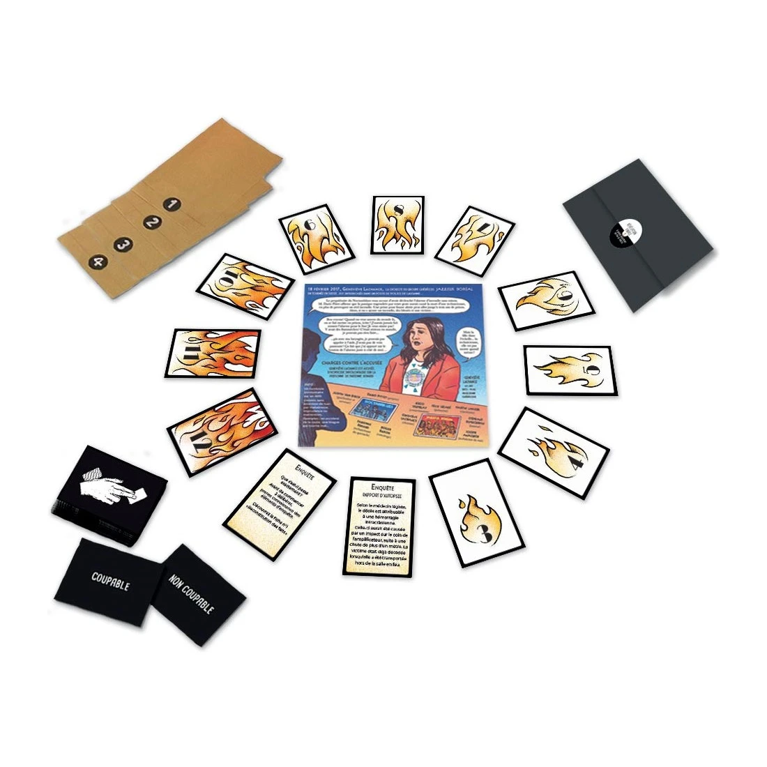 2. Dévoilez les 4 fiches d’enquête au fil de la partie et engagez le débat !3. Rendez votre verdict en votant anonymement avec les Cartes de Vote final. Coupable ou Non Coupable ?