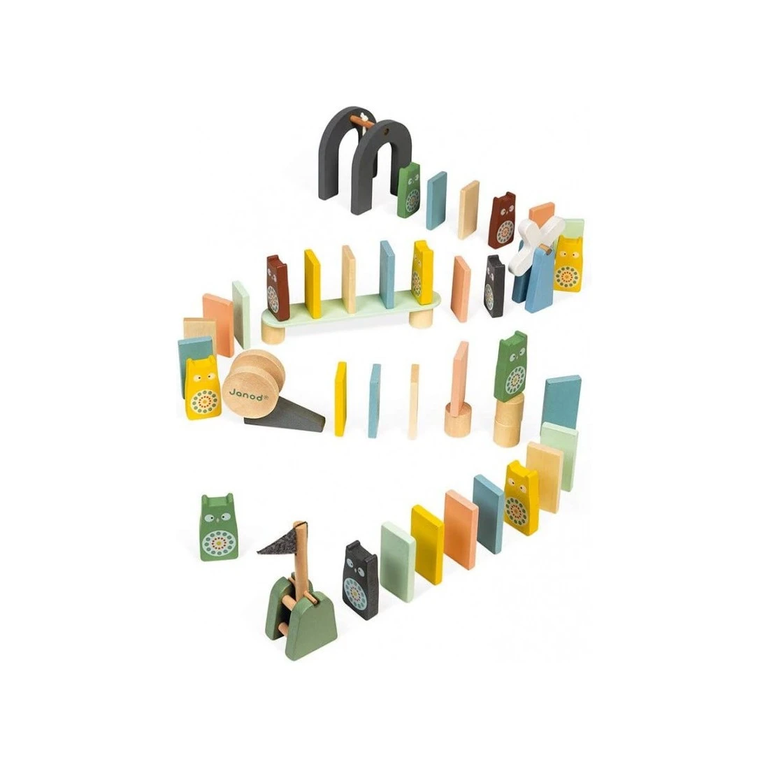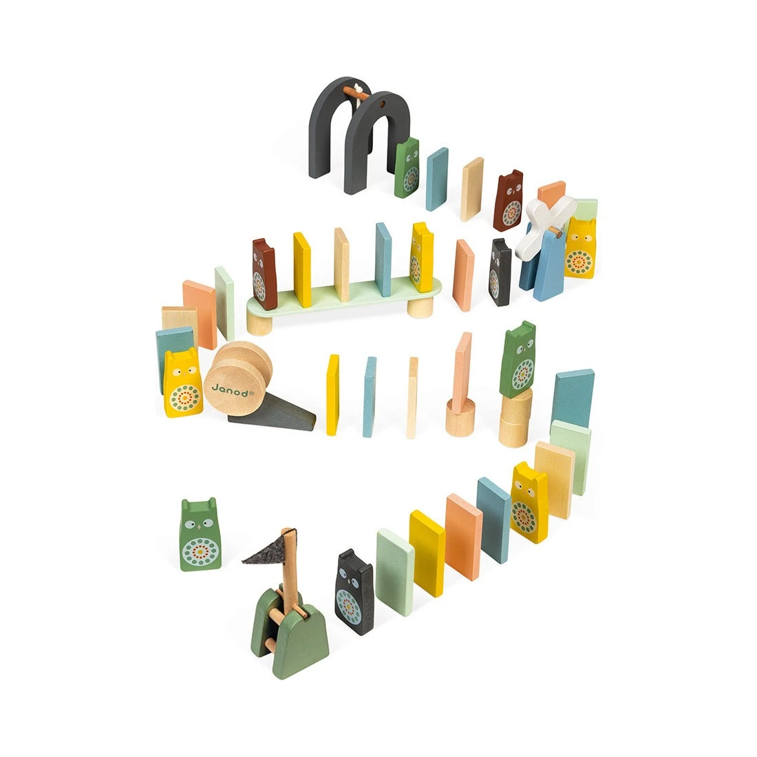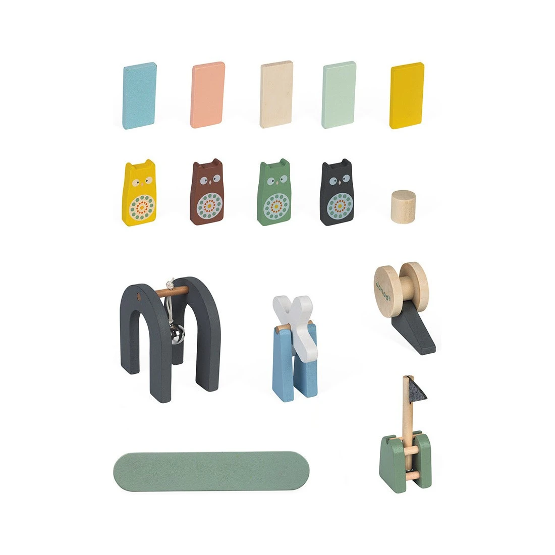 Un nombre infini de combinaisons sont possibles ! Des plots, un pont, un moulin, un drapeau, une clochette, une pente et une bobine sont inclus pour animer le parcours. Ce jeu promet de bons moments de partage et de rire en famille ou entre amis, il est aussi éducatif : idéal pour explorer la relation de cause à effet, utilisez les dominos pour mettre en valeur cette notion et montrer à l’enfant que toute action à des conséquences.