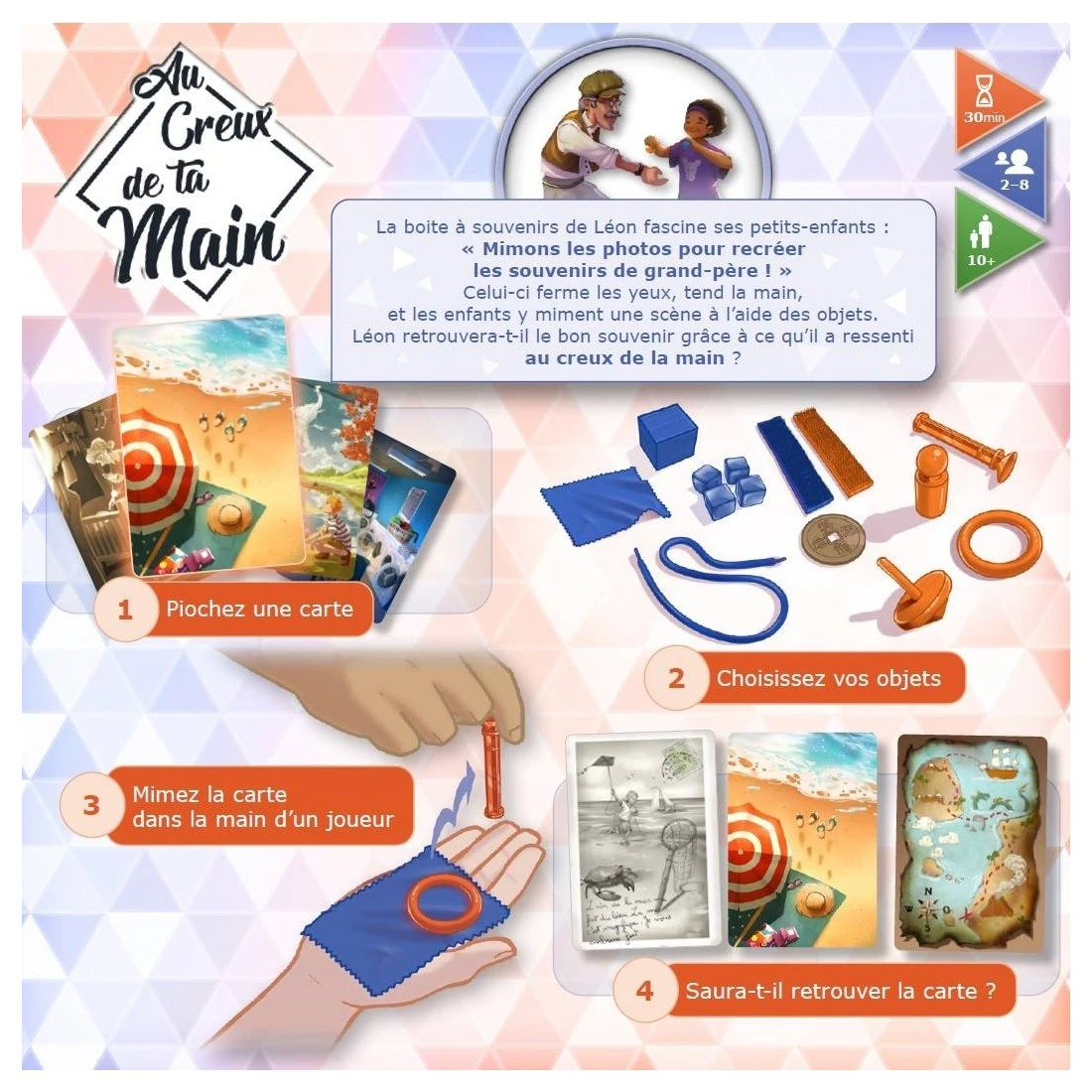 « Au Creux de ta Main » est un jeu original et poétique vous invitant à jouer avec le sens du toucher. Le jeu raconte la vie d’un grand-père, Léon, qui présente ses souvenirs à ses petits-enfants. Les souvenirs sont répartis sur 100 cartes joliment illustrées. Le jeu contient aussi 11 Objets pour que les joueurs miment les souvenirs de Léon. À son tour, un joueur pioche une carte, choisit des objets et mime le souvenir dans la main d’un joueur qui a les yeux fermés et joue le rôle du grand-père. Ce dernier se concentre sur les sensations ressenties grâce au mime. Les adversaires voient également le mime et doivent trouver, parmi leurs cartes en main, celle qui peut correspondre à la scène mimée afin de brouiller les pistes du grand-père. Saura-t-il retrouvé le bon souvenir parmi 8 cartes différentes ?