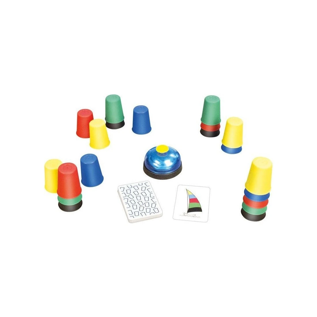 Dans Crazy Cups, chaque joueur reçoit cinq gobelets en cinq couleurs. A chaque début de tour, une carte combinant cinq éléments reprenant les mêmes couleurs que les gobelets est révélée. Les joueurs doivent alors aligner ou empiler rapidement leurs gobelets afin de reproduire exactement la même disposition que celle des éléments de la carte. Attention, il est important de bien suivre l’ordre et le sens des couleurs ! Dès qu’un joueur a terminé, il appuie vite sur la sonnette. Le plus rapide à réaliser correctement sa série remporte la carte en jeu et c’est reparti pour un tour. Restez bien attentifs et ne perdez pas de vue votre objectif car pour gagner à Crazy Cups, il faut avoir de la suite dans les gobelets !
