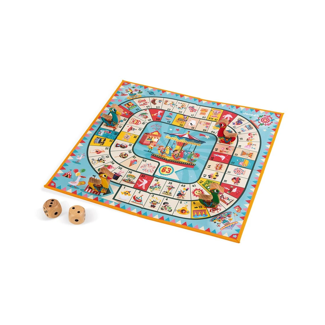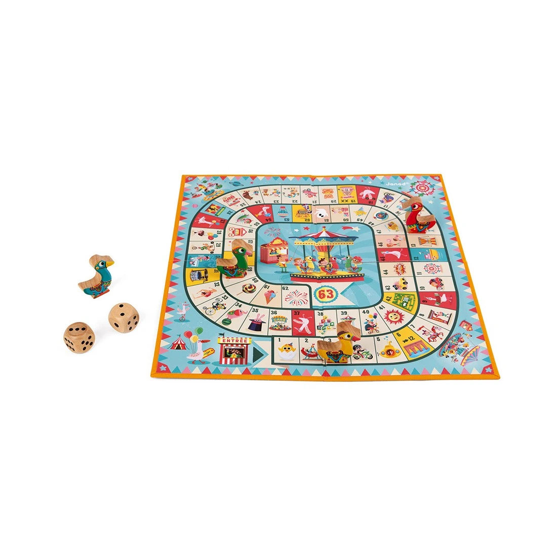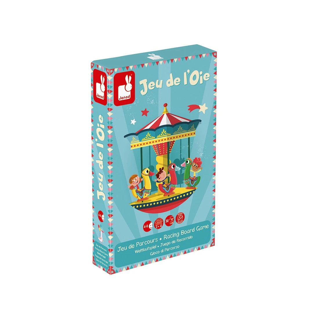 Découvrez le jeu de l’oie carrousel de Janod, le célèbre jeu de parcours revisité sur le thème de la fête foraine pour les enfants à partir de 4 ans. Le but du jeu est d’aider son oie a? retrouver le mane? ge en l’emmenant au bout du parcours et en e?
