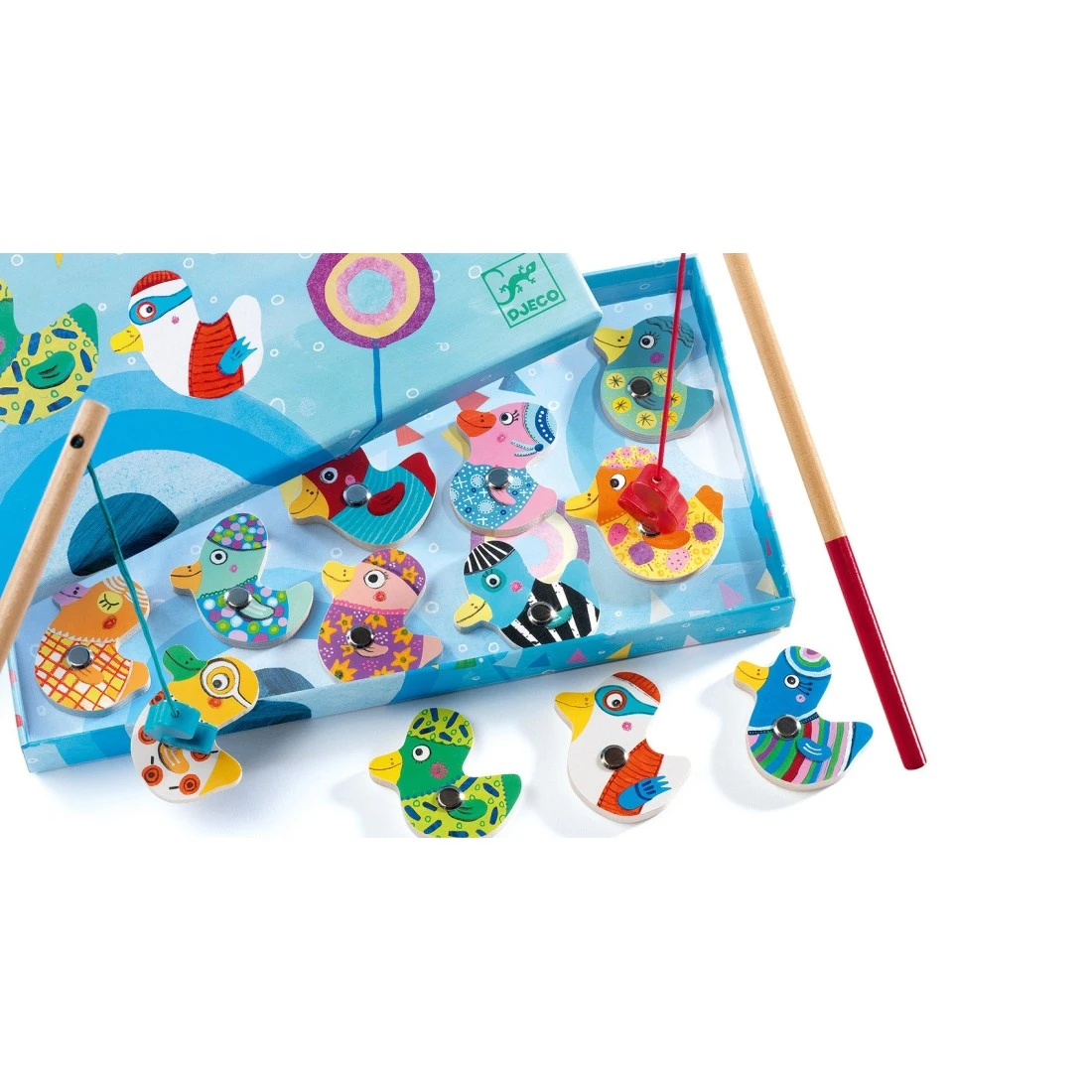 Prêts pour une partie de pêche ? Des canards en bois, 2 cannes à pêche et une jolie boîte qui se transforme en bassin de fête forraine. L’enfant attrape les canards en bois aimantées à l’aide de la canne. La partie de pêche peut commencer ! Pour les petits pêcheurs à partir de 2 ans.