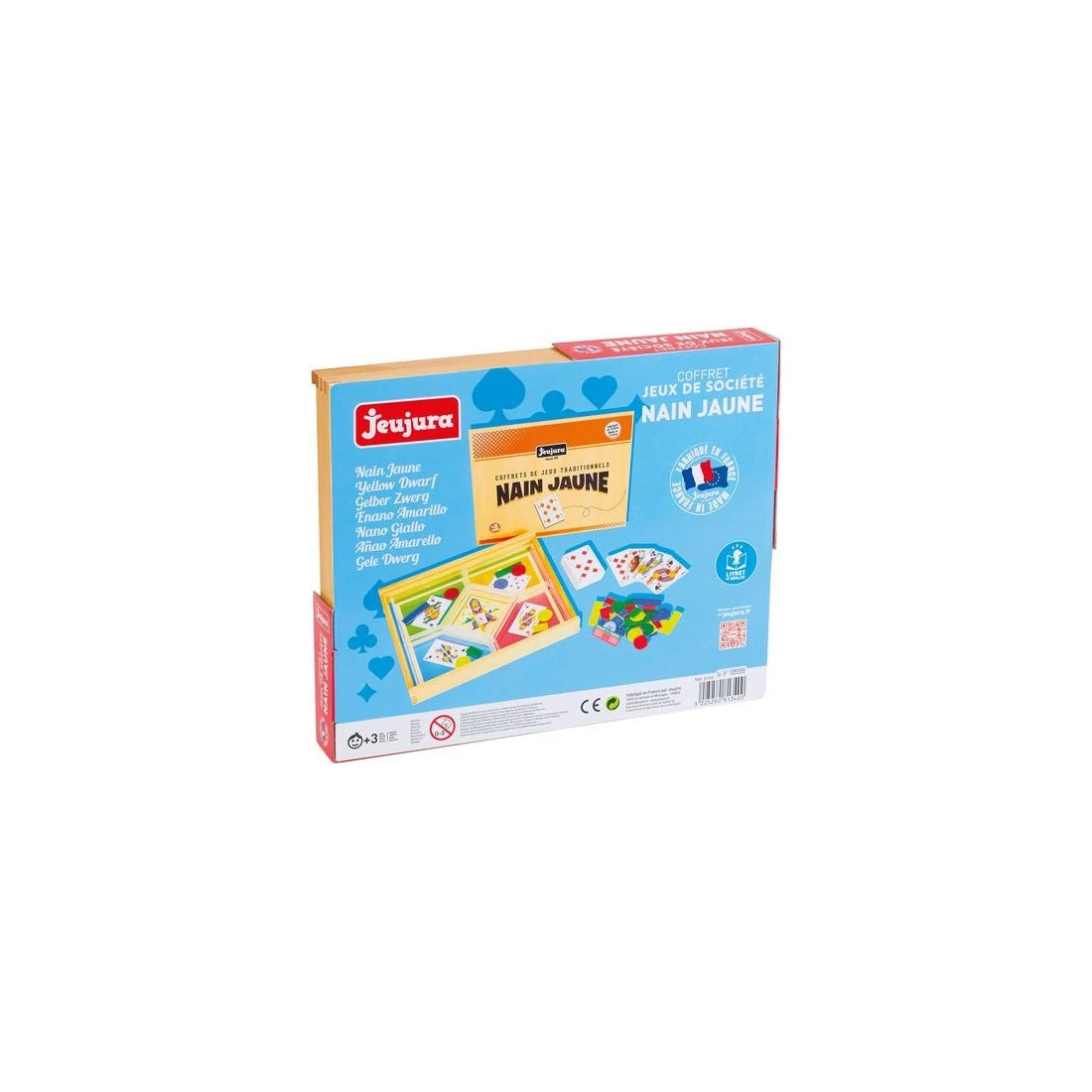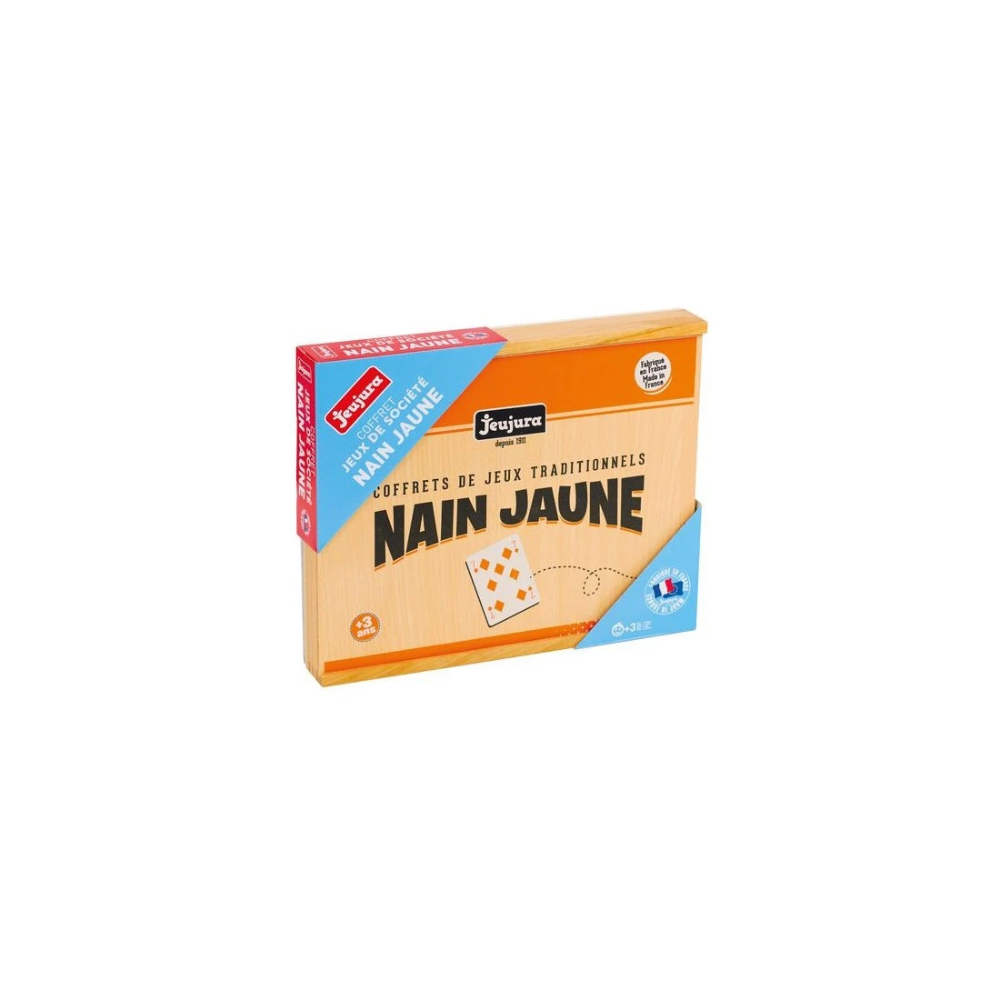Faites découvrir à vos enfants le jeu du nain jaune ! Dans ce beau coffret sérigraphié de Jeujura, vous trouverez un jeu de 54 cartes, un sachet de jetons, des cases amovibles et la règle du jeu.