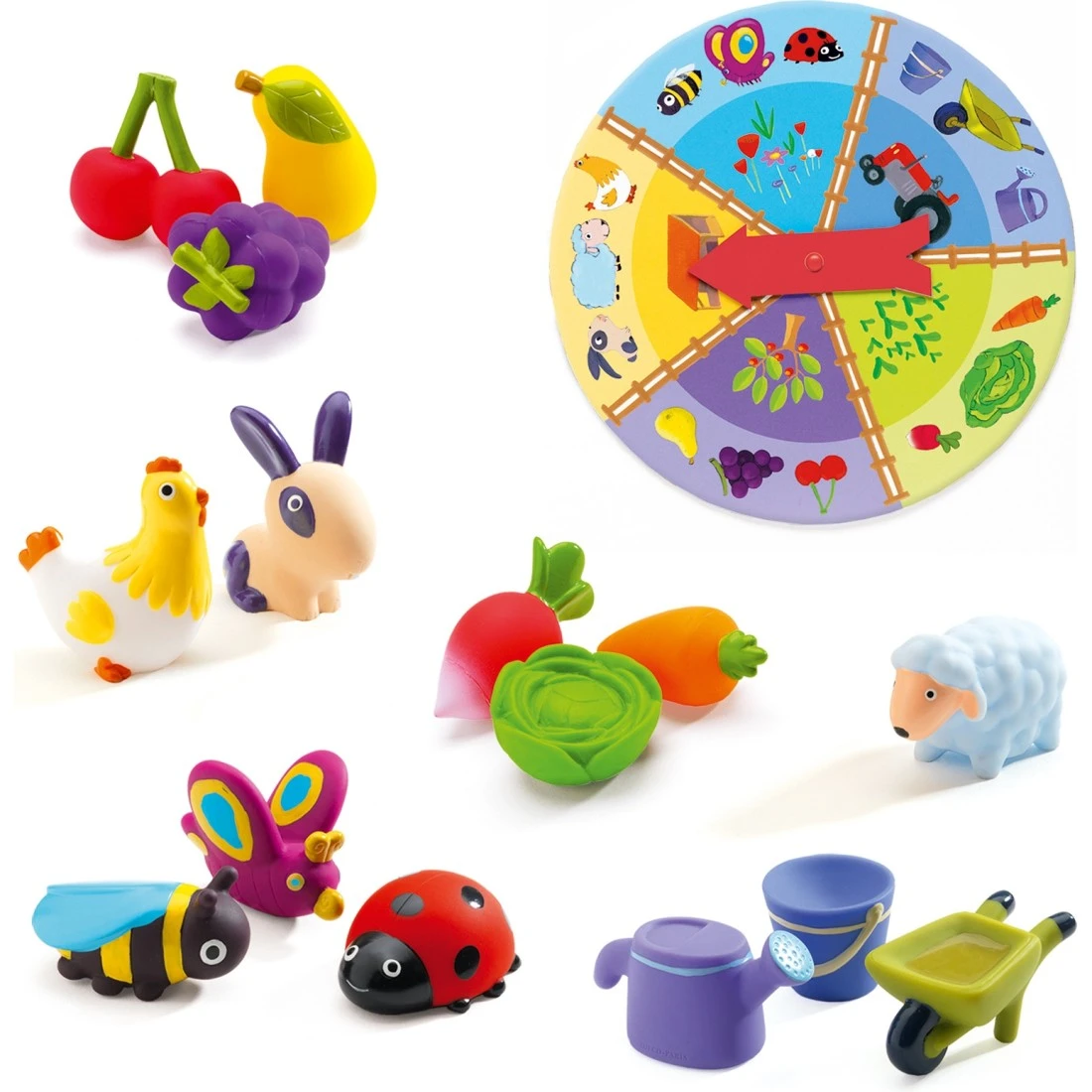 Après avoir lancé la flèche sur la roue pour connaître l’objet, l’insecte ou l’animal de la ferme à trouver, l’enfant le cherchera au toucher dans un sac de tissu.