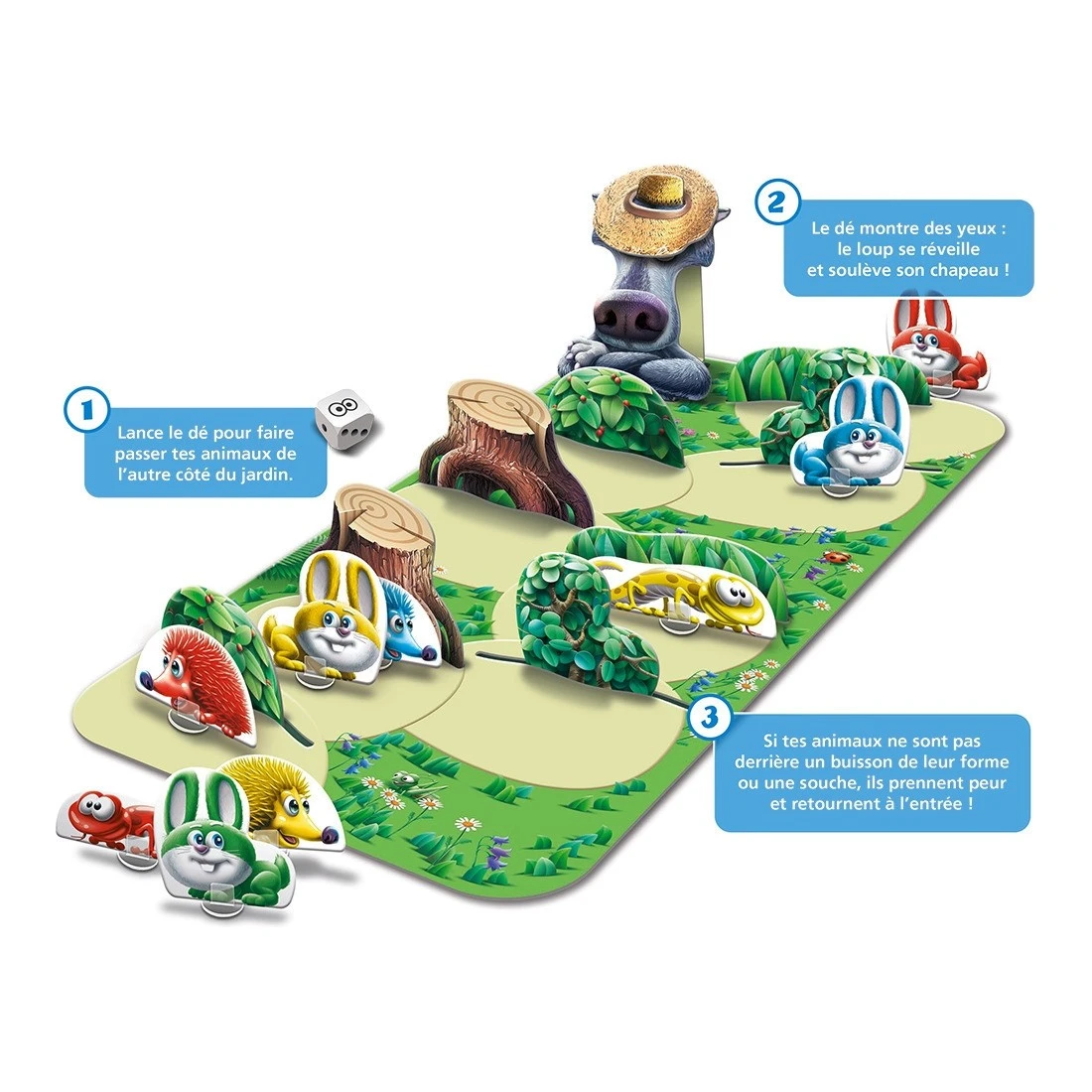 Mais si le dé affiche le loup, celui-ci se réveille et effraye tous les animaux qui ne sont pas correctement cachés!