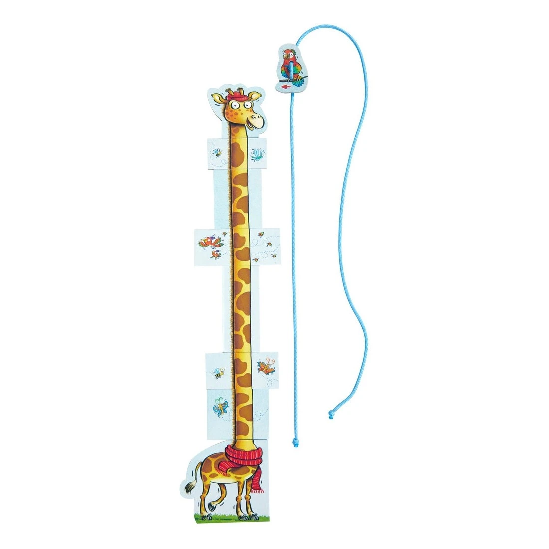 Règles de jeu courtes:Étalez les tuiles « cou », symboles visibles. Former 4 piles avec les tuiles « symbole », faces taches de girafe visibles. Remettre à chaque joueur une tête et un corps de girafe.On joue à tour de rôle. Celui à qui vient le tour retourne la tuile « symbole » du dessus de la pile de son choix. Le joueur sélectionne une tuile « cou » portant ce symbole et la retourne.Elle vient allonger le cou de sa girafe et la tuile « symbole » est retirée du jeu.Le jeu s’achève dès que la dernière tuile « cou » est posée. Tous les joueurs comptent les taches sur le cou de leur girafe. Le joueur dont la girafe a le plus long cou (= le plus de taches) remporte la partie. Les joueurs peuvent aussi se servir de Pépé le perroquet pour mesurer la longueur du cou des girafes.
