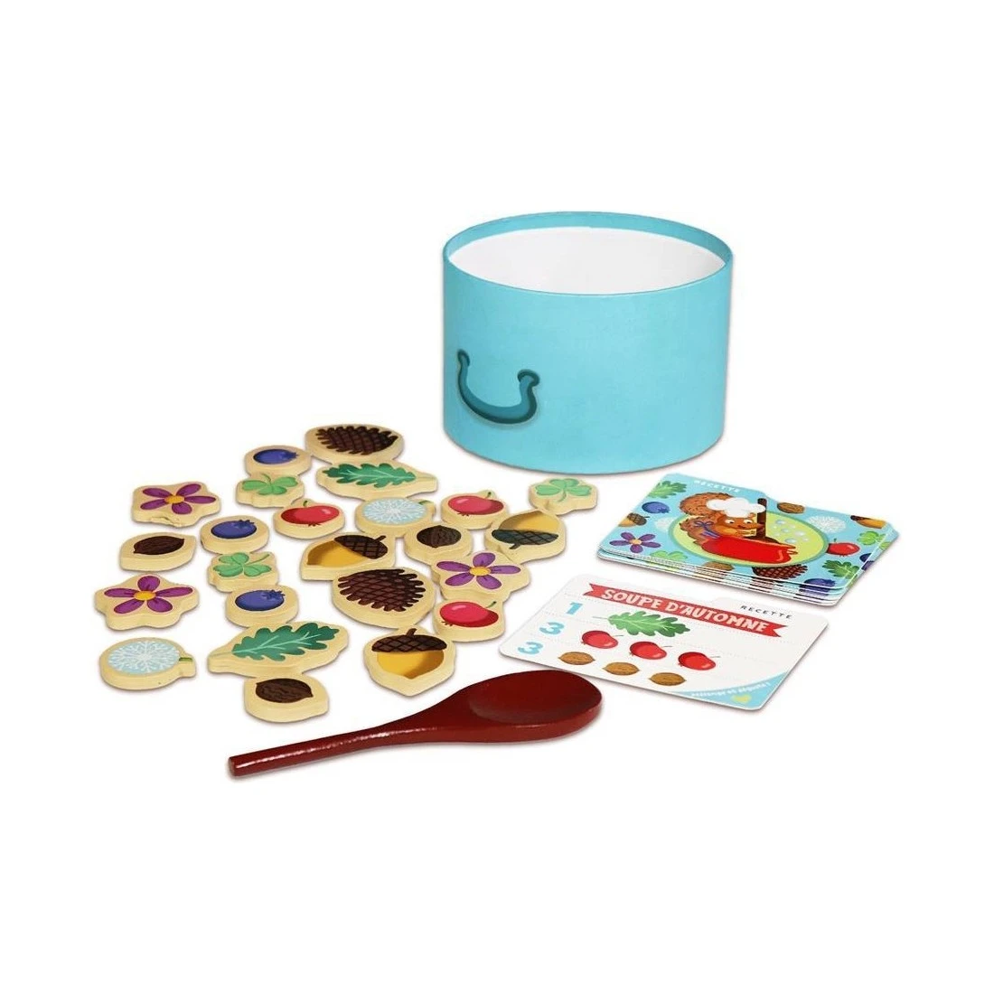 Le fond de la boîte ronde sert également de bol, qui contient des ingrédients en bois et une cuillère en bois robuste pour mélanger et remuer. Des fiches de recettes simples enseignent aux tout-petits à identifier les ingrédients et à compter pendant qu’ils cuisinent. Mélangez, remuez, mangez et jouez ensemble !