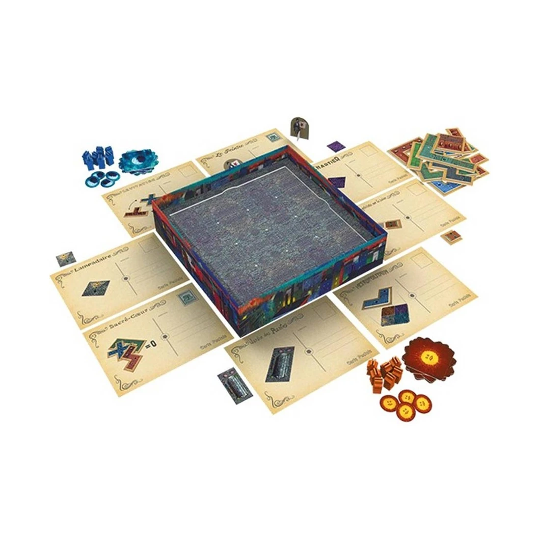 - Contenu : 1 plateau intégré à la boîte, 16 tuiles Pavé, 12 tuiles Bâtiment, 14 pions Cheminée, 12 cartes postales, 8 jetons action, 1 livret de règles.