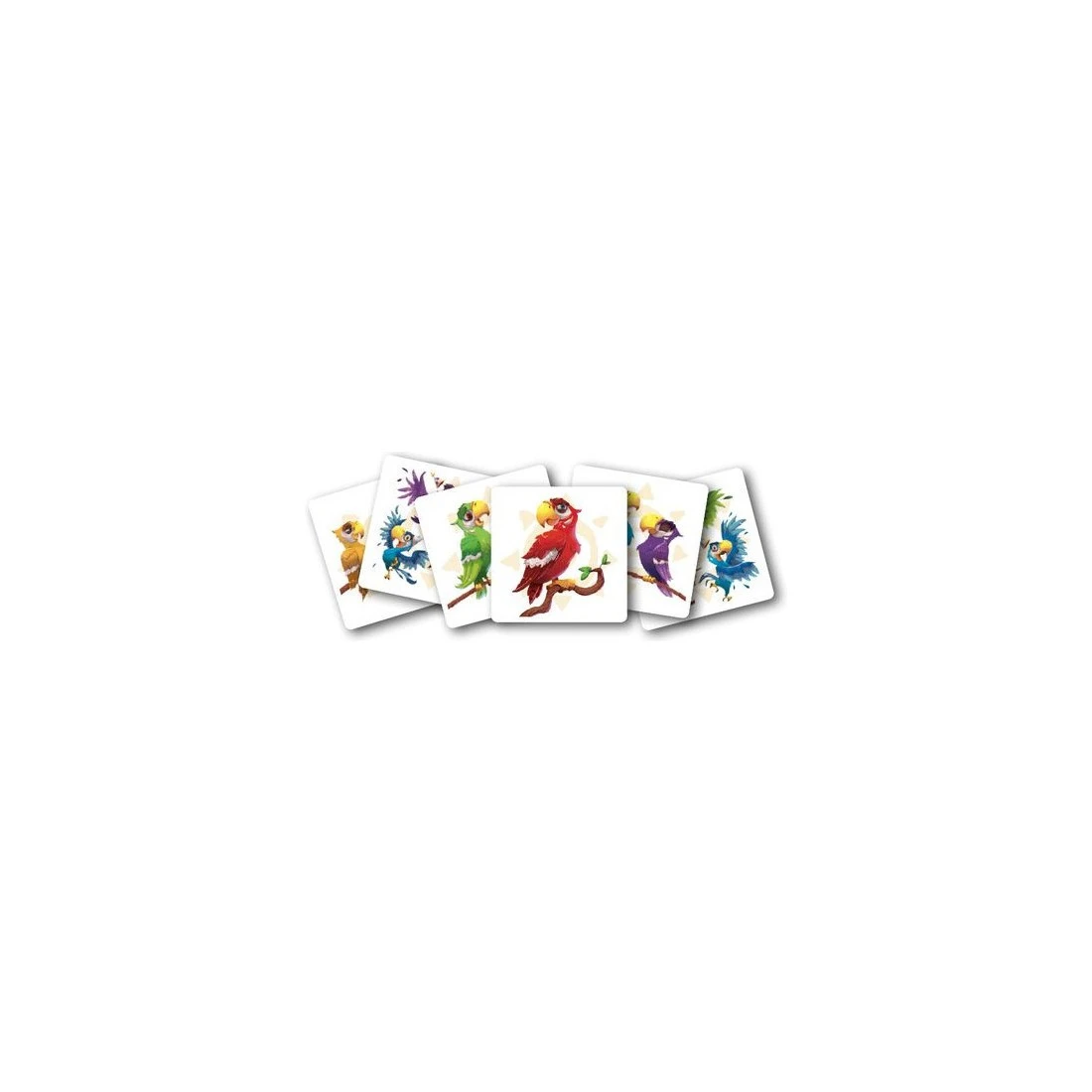 Mais attention, chaque carte jouée doit posséder au moins un perroquet de la même couleur que la dernière carte de la défausse. Et les perroquets sont bavards : à chaque fois qu’on pose une carte il faut dire un mot ! Si la dernière carte de la défausse est un perroquet sage il faut dire un mot qui rime avec le mot précédent.
