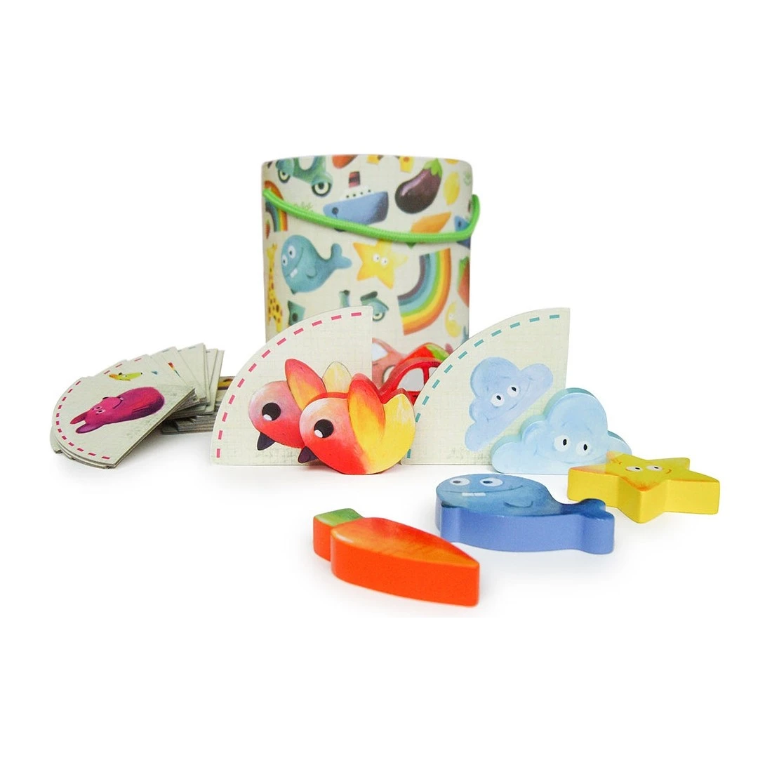Jeu de reconnaissance tactile qui consiste à mettre la main dans le sac pour trouver les pièces demandées. 21 pièces en bois dont une pièce piège, et 20 cartes illustrées. Possibilité d’utiliser le jeu comme un loto. Notice d’explication en 5 langues à l’intérieur de la boite.
