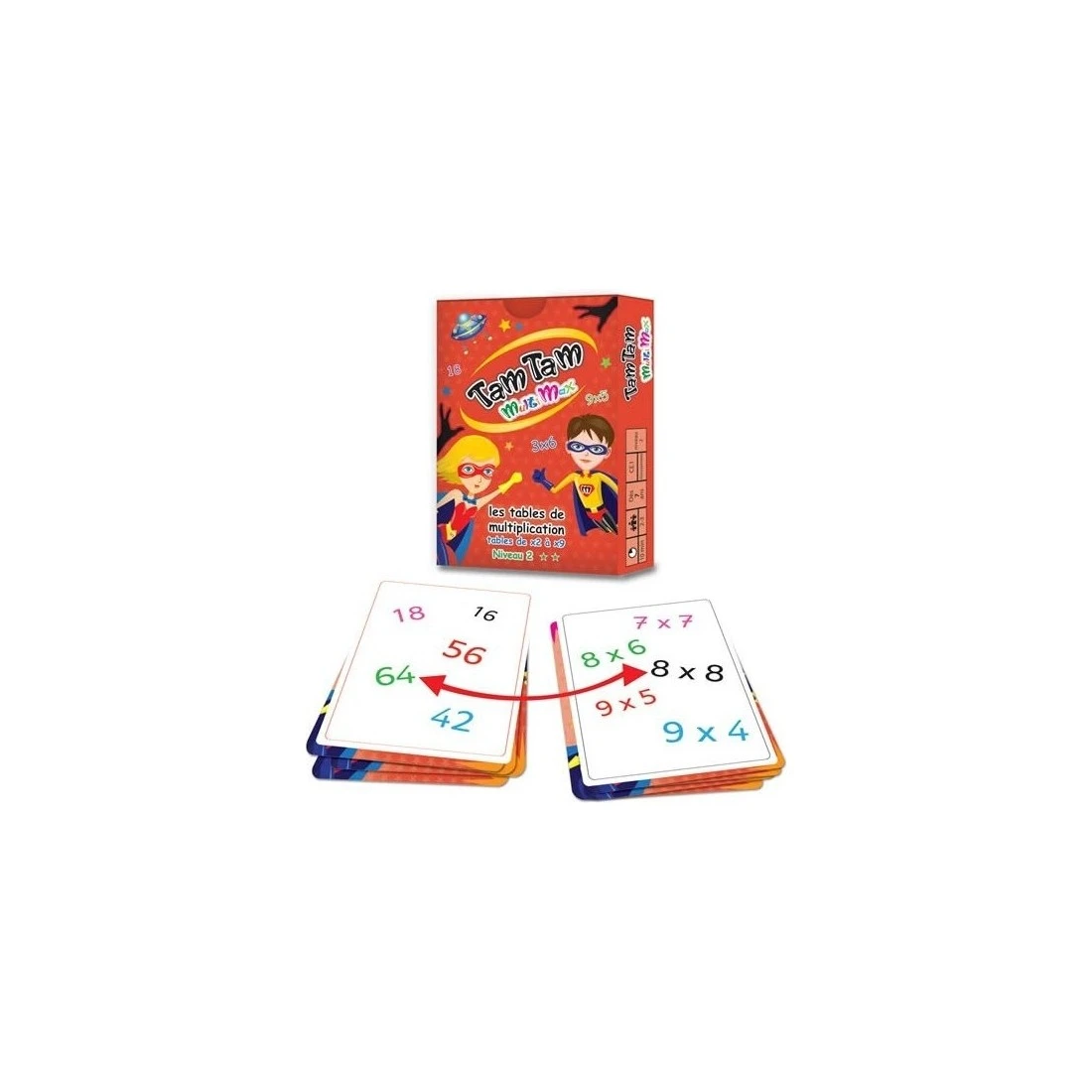 Tam Tam Multimax niveau 2 renforce la mémorisation des tables de multiplication de X2 à X9 (programme CE1). Chaque table est représentée sur une carte de couleur qui facilite la mémorisation. Des astuces de mémorisation sont expliquées. Le jeu propose 3 façons de jouer pour mieux s’adapter au niveau de l’enfant: nombre/nombre, résultat/opération, opération/opération.