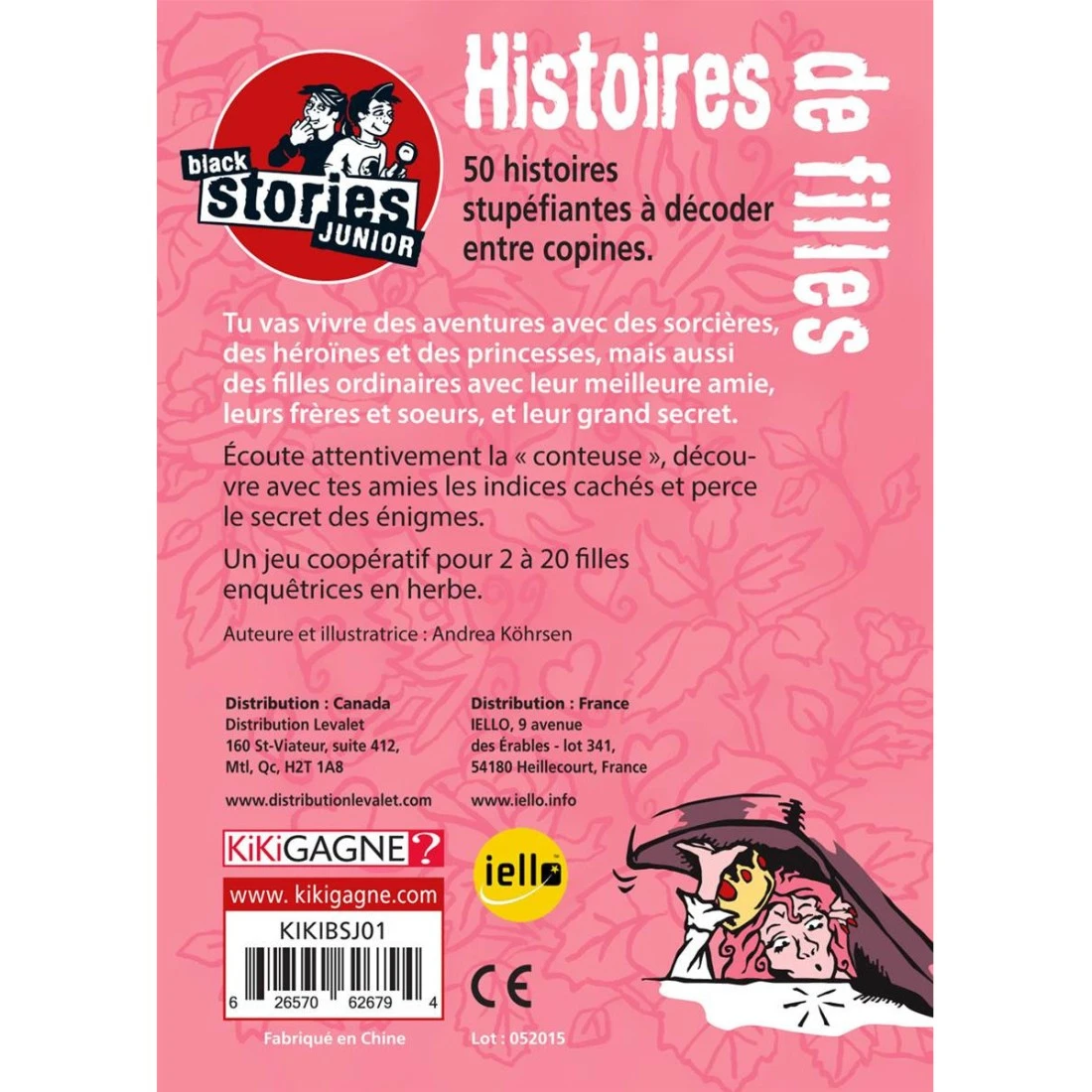 Dans le jeu Black Stories Junior – Histoires de Filles, tu vas vivre des aventures avec des sorcières, des héroïnes et des princesses, mais aussi des filles ordinaires avec leur meilleure amie, leurs frères et soeurs, et leur grand secret.