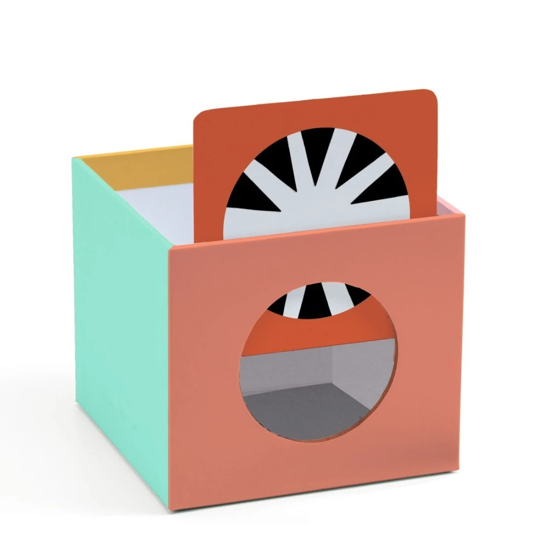 - Des pièces en carton épais, faciles à attraper et une astucieuse boîte-tirelire à jouer.