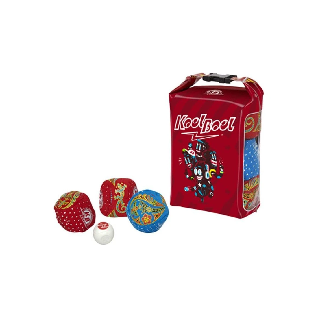 - 6 boules en tissu imprimé avec double coque remplies de billes en plastique recyclé et un cochonnet en vinyle dans un sac de transport imprimé original.