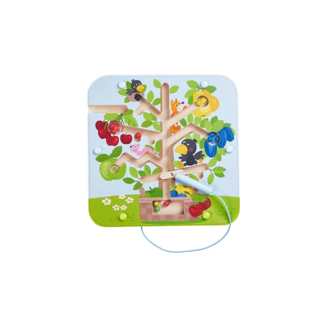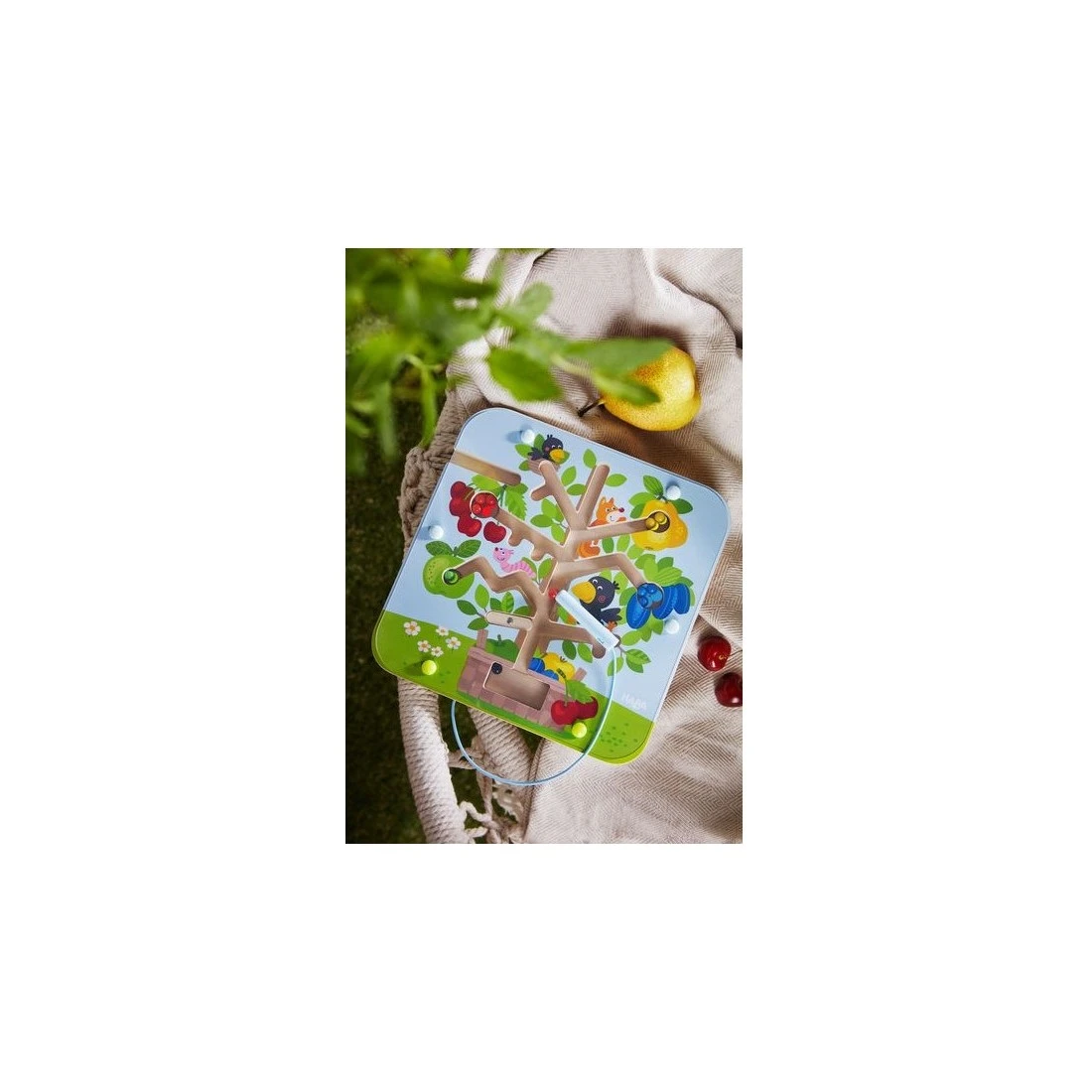Le stylet aimantée permet aux jeunes amateurs de fruits bien mûrs de déplacer les billes selon leurs envies, de les compter ou de les trier par couleur. Les billes multicolores se transforment en pommes, prunes, poires et cerises sur l’arbre et peuvent être récoltées. Mais attention, la bille noire du corbeau ne doit pas atterrir dans le panier !