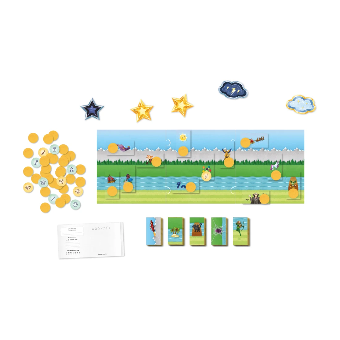 Chaque conteur et conteuse se voit attribuer un nombre de jetons Histoire figurant un symbole unique puis la partie se déroule en deux chapitres. Chapitre 1, les conteurs et conteuses choisissent une tuile Personnages et la place face visible sur le plateau de jeu en lui attribuant un jeton Histoire. Ce jeton est ensuite mis face cachée après que toute l’équipe en ait pris connaissance. La partie se poursuit jusqu’à ce que tous les jetons Histoire aient été joués. Chapitre 2, les conteurs et les conteuses, à tour de rôle, choisissent un des personnages de l’histoire et raconte ce qui lui arrive en intégrant le symbole qu’il ou elle pense lui être associé. La partie prend fin quand tous les jetons Histoire ont été révélés. En cas d’échec, le ciel s’obscurcit à cause des nuages orageux et en cas de succès, le ciel s’illumine d’étoiles. Coopérez, aidez-vous pour émerveiller les contes !