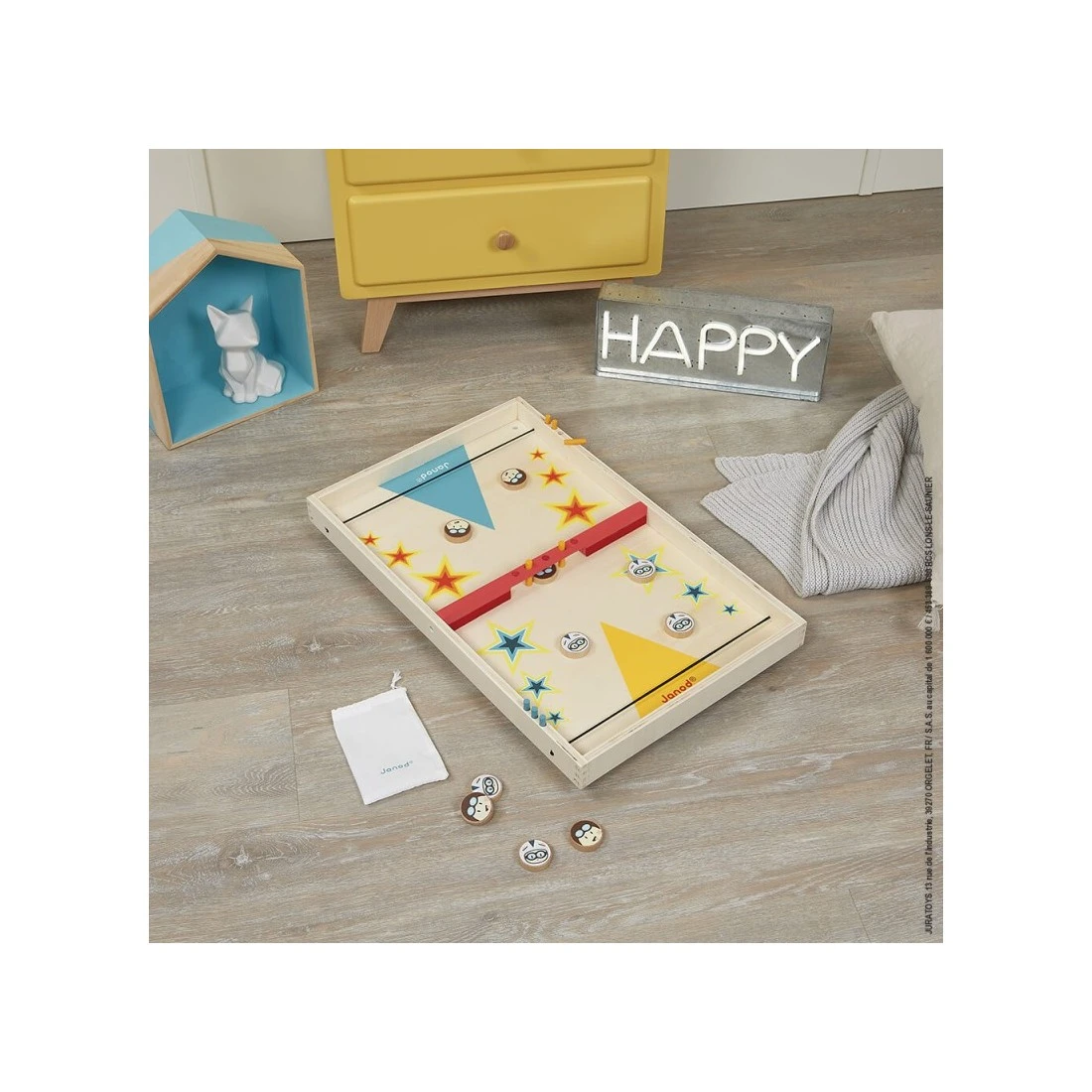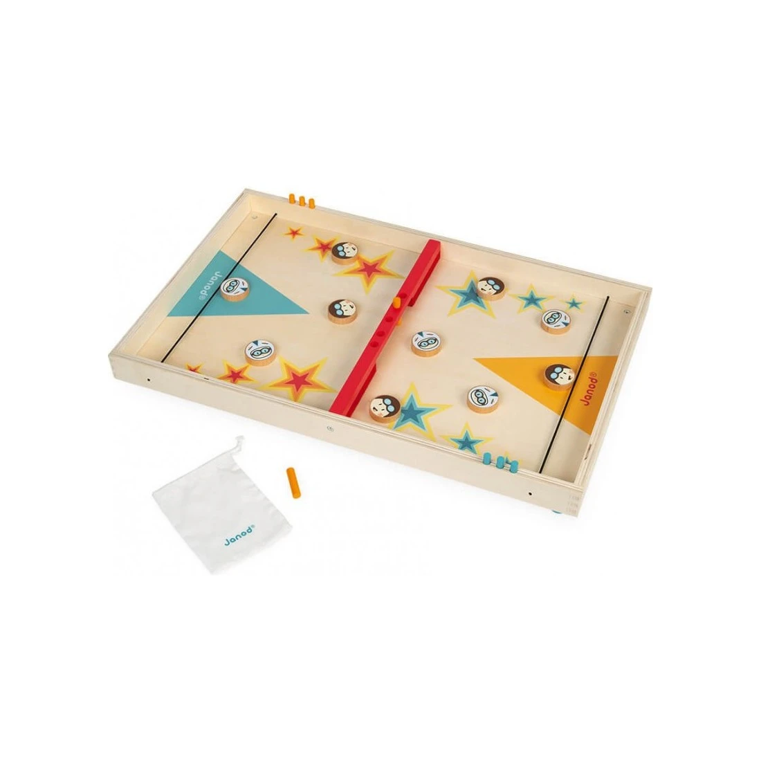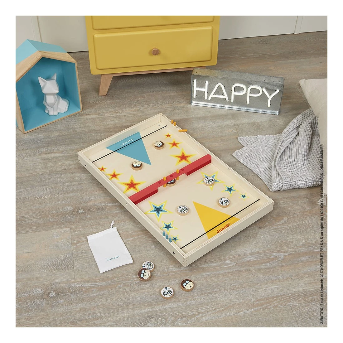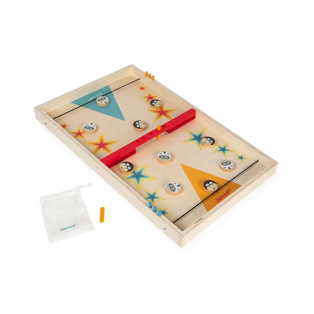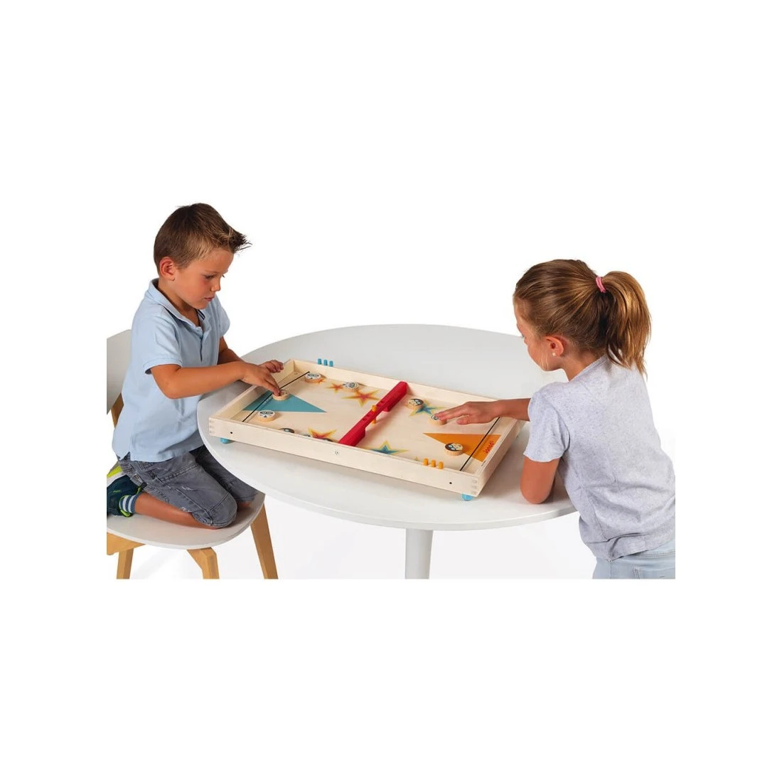 Connaissez-vous les principes du jeu de palets ? Deux joueurs peuvent jouer à ce jeu plein de suspense et d’habileté. Vous visez à marquer le plus haut possible en utilisant un lanceur pour vous aider à passer vos pions de l’autre côté. Ce jeu est amusant et a fière allure avec des couleurs vives et du bois naturel.