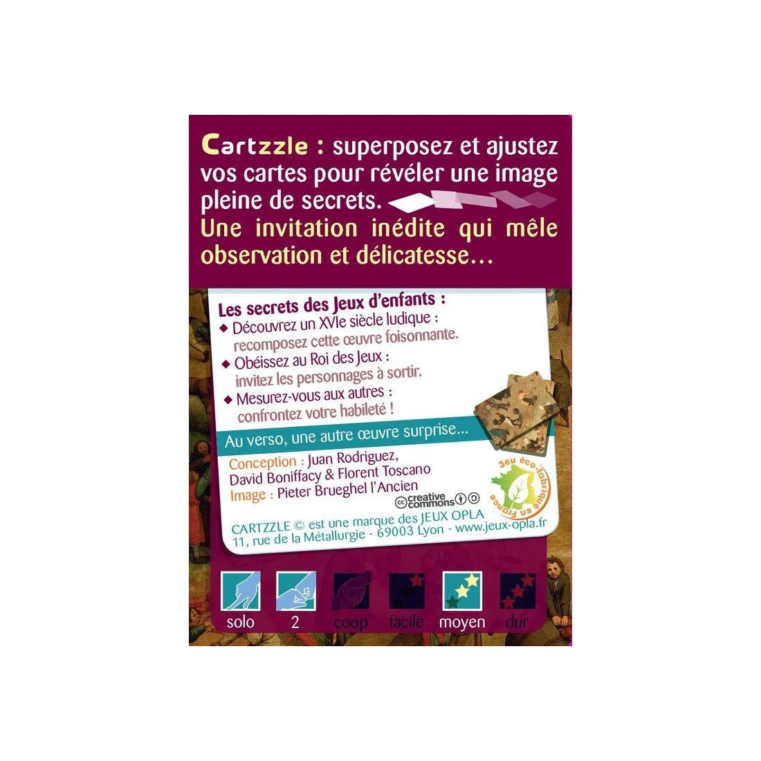 plusieurs défis de niveau variables 2. le verso secret : une autre œuvre surprise qui recèle aussi son lot de défis En Duo : même principe mais avant de commencer séparez les cartes en deux tas (grâce à des symboles qu’il faudra dissimuler) et faites la course à deux joueurs pour savoir lequel sera le plus rapide pour finir sa moitié de l’œuvre, mais attention, il y a quand même des subtilités…