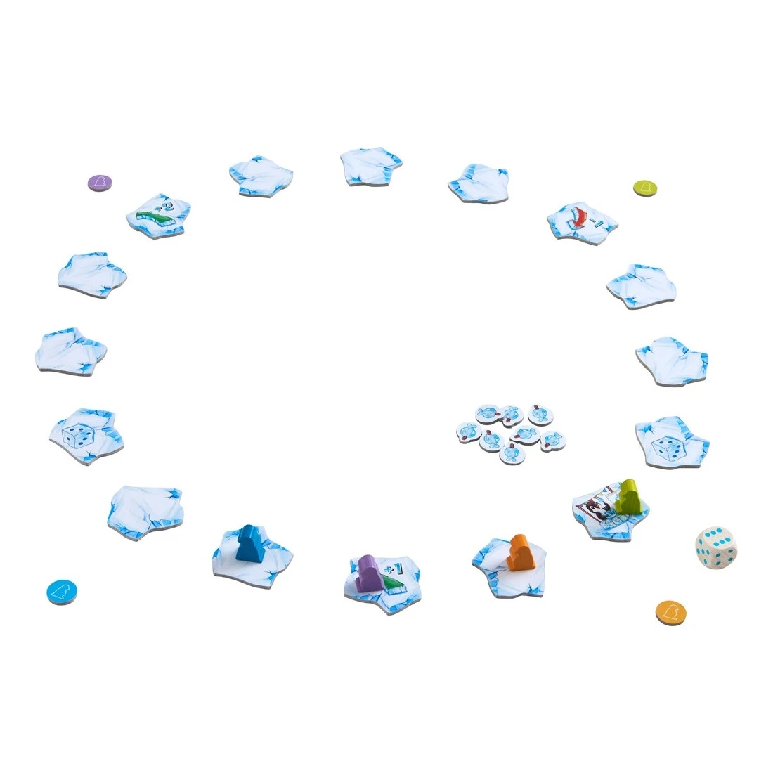 Il s’agira de poser en cercle tous les icebergs face blanche visible. Chaque joueur prend un pion « pingouin » et un pingouin de la même couleur. Posez les pingouins les uns derrière les autres en partant de l’iceberg de maman pingouin (pour le plus jeune joueur). Vous jouez à tour de rôle dans le sens des aiguilles d’une montre.