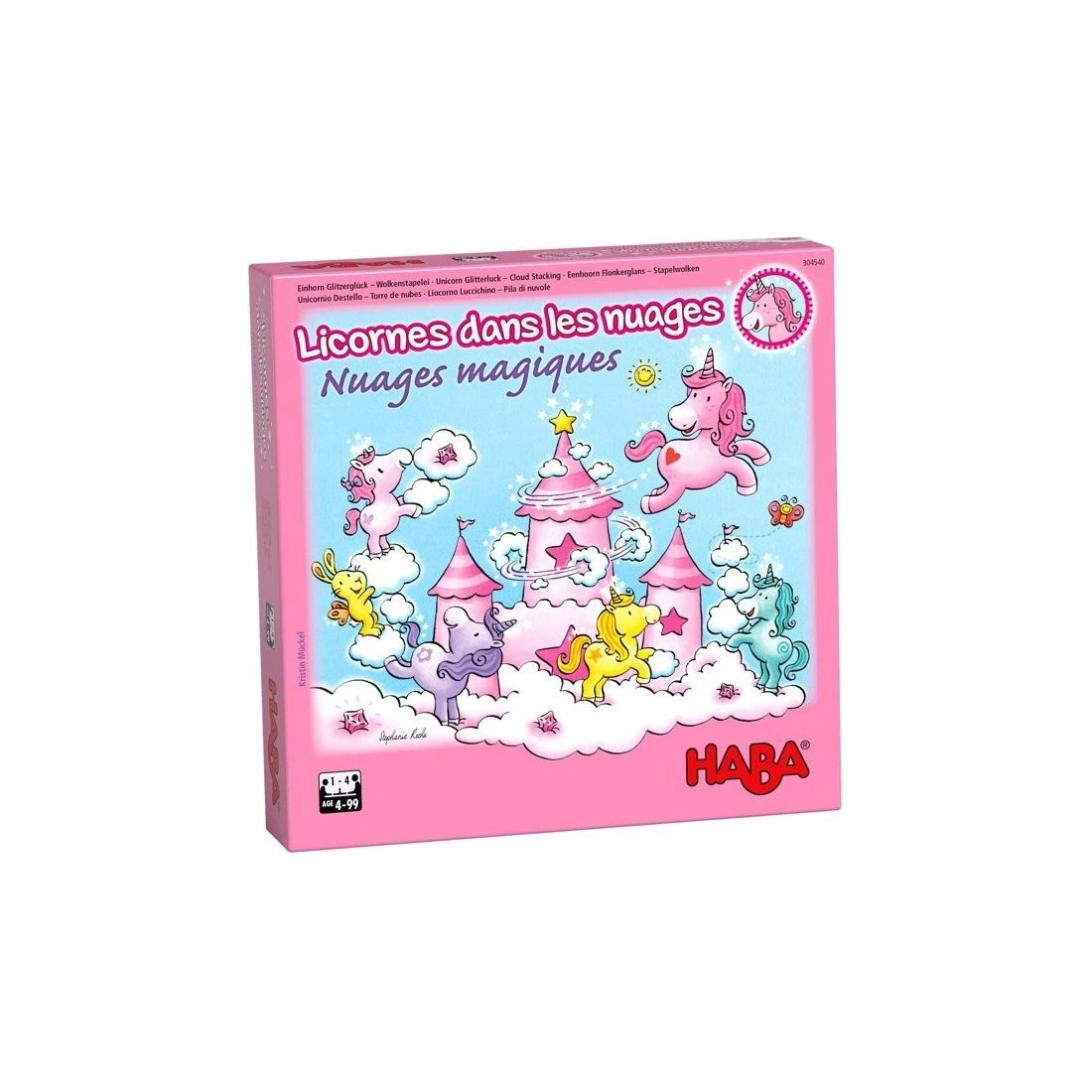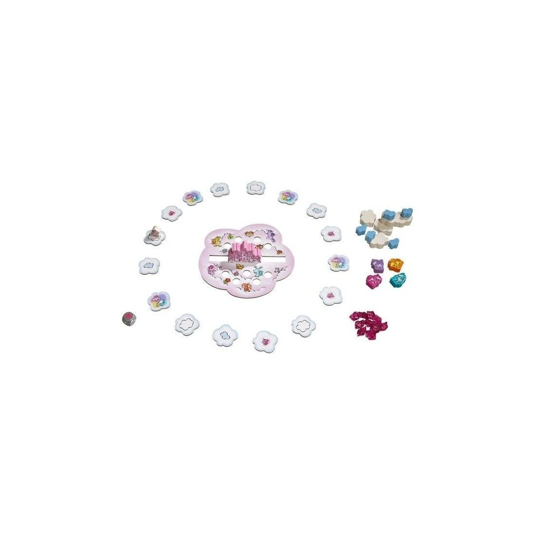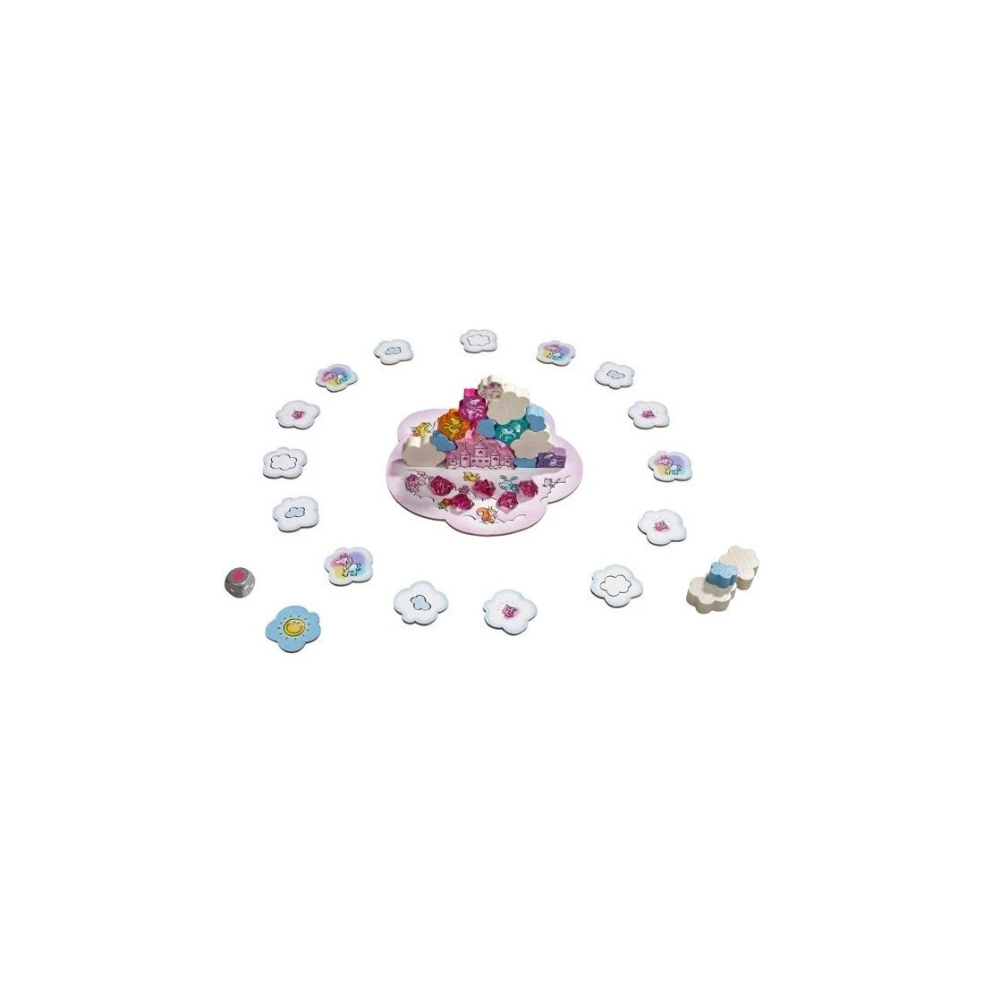 Contenu:4 licornes : Bonheur étincelant (rose), Poussière d’étoile (jaune), Fleur magique (violet) et Tourbillon magique (turquoise), 1 bébé licorne Rosalie (rose/blanc), 1 château des nuages, 5 nuages magiques blancs et 5 nuages magiques bleus en bois, 1 dé, 1 plateau de jeu « nuage », 16 tuiles « nuage », 10 cristaux de nuage, 1 règle du jeu.