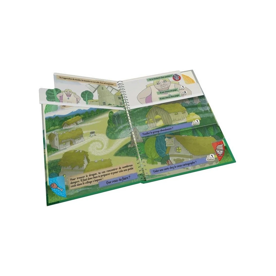 Ma première aventure : En quête du dragon – Ouvre le livre et choisis ton personnage sur la roue rouge : Lina la bagarreuse forte et courageuse, Timon le magicien savant et malin, Sachat le chat-pardeur discret et voleur ? Et maintenant, l’aventure peut commencer. Tu vas pouvoir lire ce livre normalement, de gauche à droite, mais rapidement, tu feras face à des choix matérialisés par des pages coupées en trois. Tourne la partie de ton choix et découvre ce qu’il va se passer. Après plusieurs choix, tu arriveras à la fin de ton aventure… Réussiras-tu à adopter le dragon ? Une fois la lecture terminée, il ne reste qu’à recommencer pour faire mieux, découvrir de nouveaux chemins ou essayer avec un autre personnage.