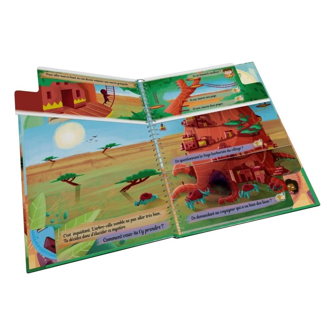 Ouvre le livre et choisis ton personnage : Maïlune la chasseuse courageuse, Issa sa soeur, gentille et bavarde, ou Sumai leur petit frère, le cueilleur. Et maintenant, ton voyage peut commencer. Tu vas pouvoir lire ce livre normalement, de gauche à droite, mais rapidement, tu feras face à des choix matérialisés par des pages coupées en trois. Tourne la partie de ton choix et découvre ce qu’il va se passer. Après plusieurs choix, tu arriveras à la fin de ton aventure… Réussiras-tu à trouver la cause de la grande sécheresse ? Une fois la lecture terminée, tu peux recommencer pour découvrir de nouveaux chemins ou essayer avec un autre personnage.