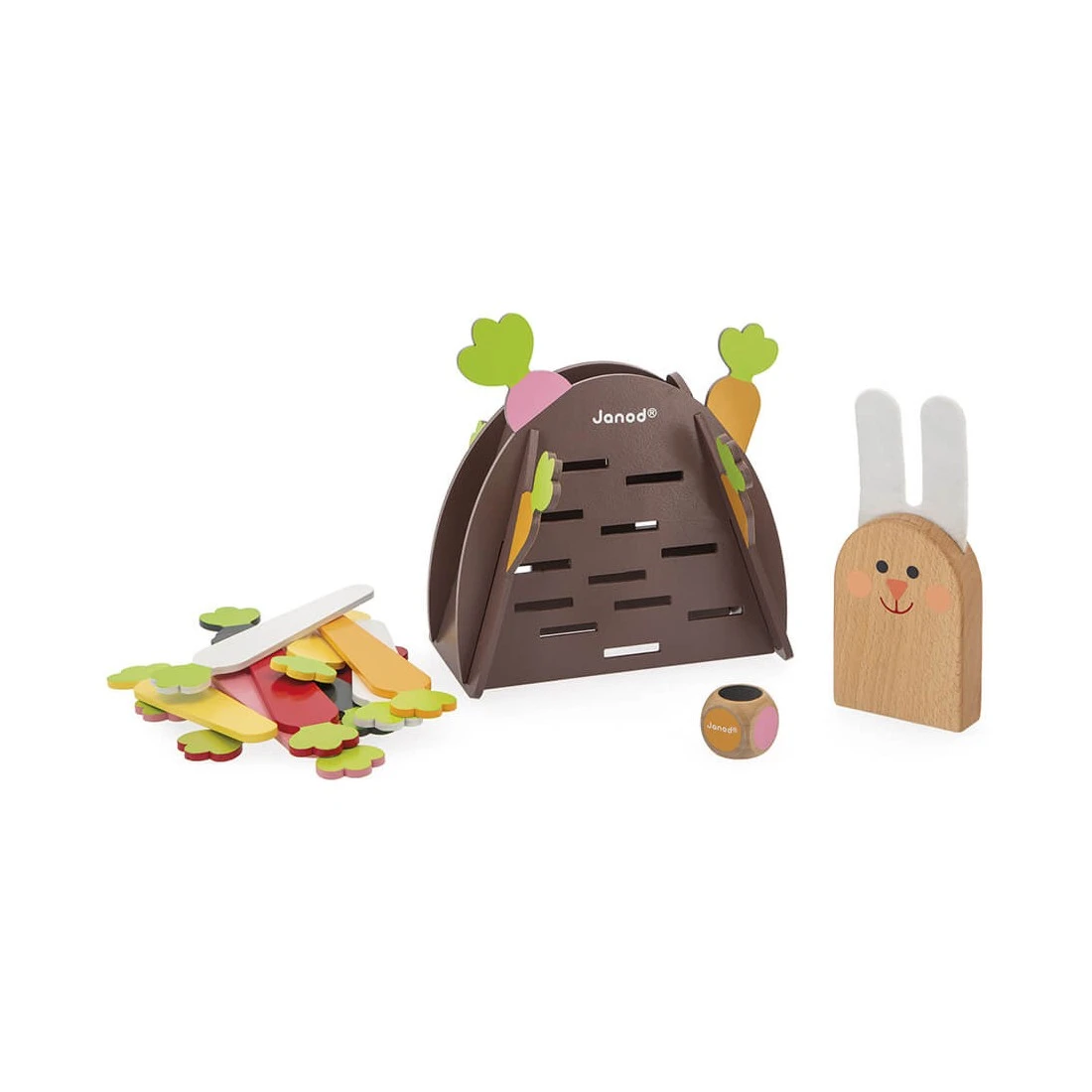 Un support parfait pour jouer entre copains ou en famille ! Contient : 1 terrier, 1 lapin en bois et feutrine, 12 carottes en bois de couleurs différentes et 1 dé en bois. Jeu de société en bois issu de forêts gérées durablement, certifiées Fsc®.